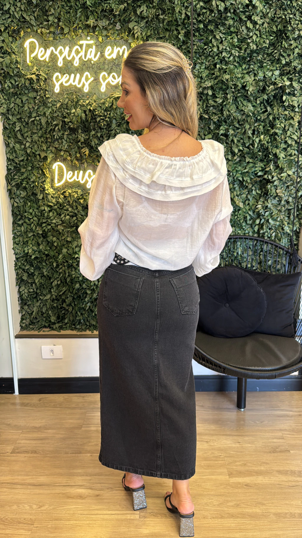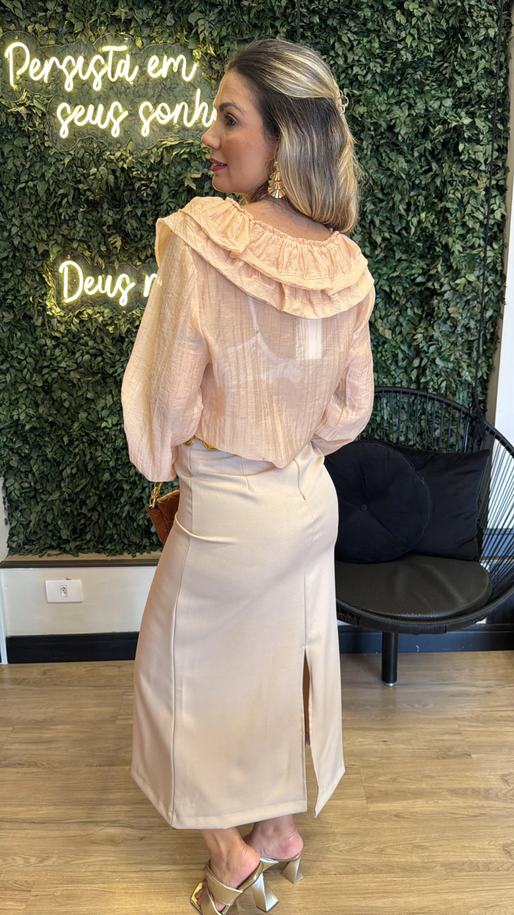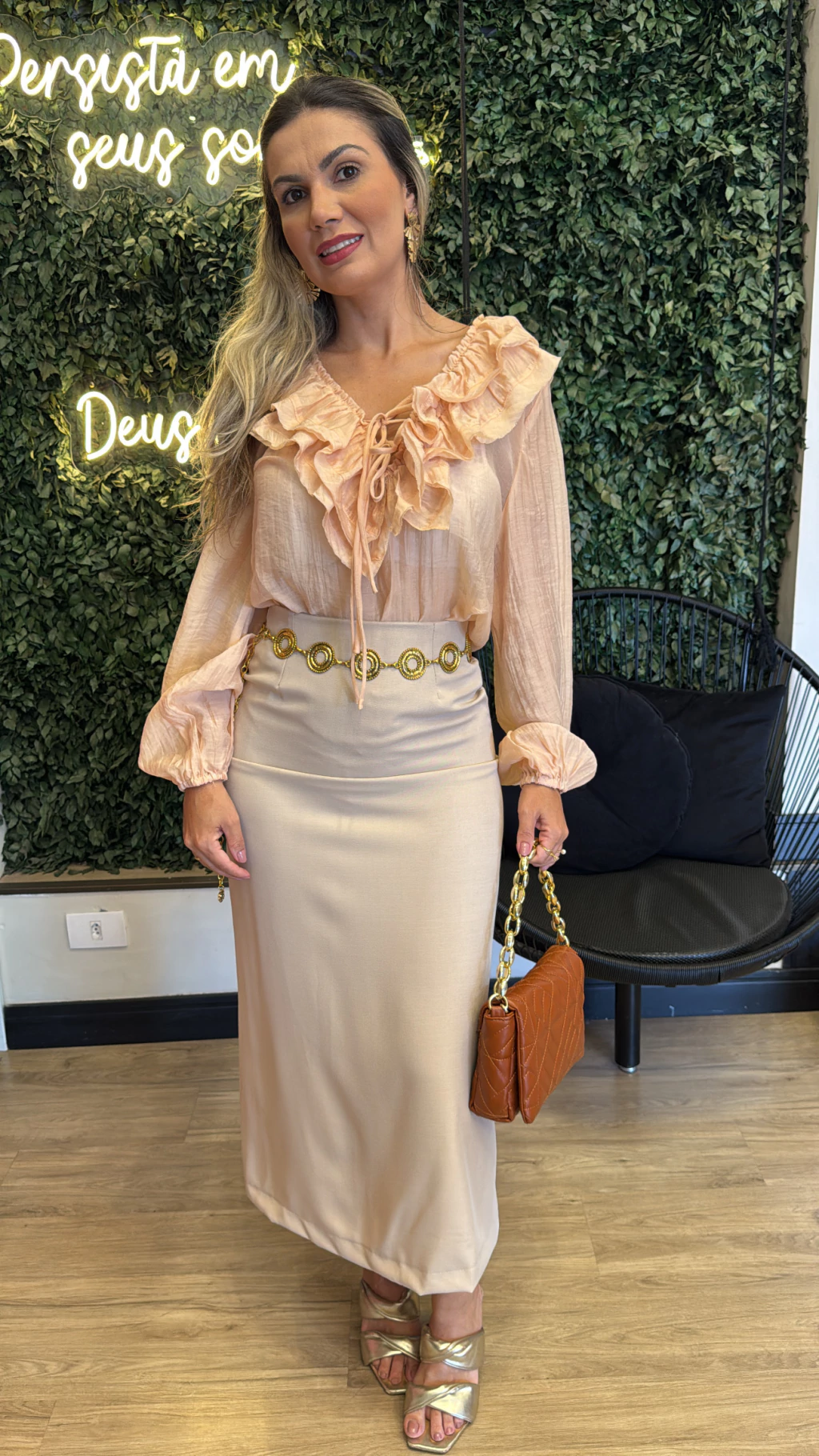 Bata em cambraia, mangas longas fluidas, decote V com amarração no busto, babado que deixa um charme na peça.