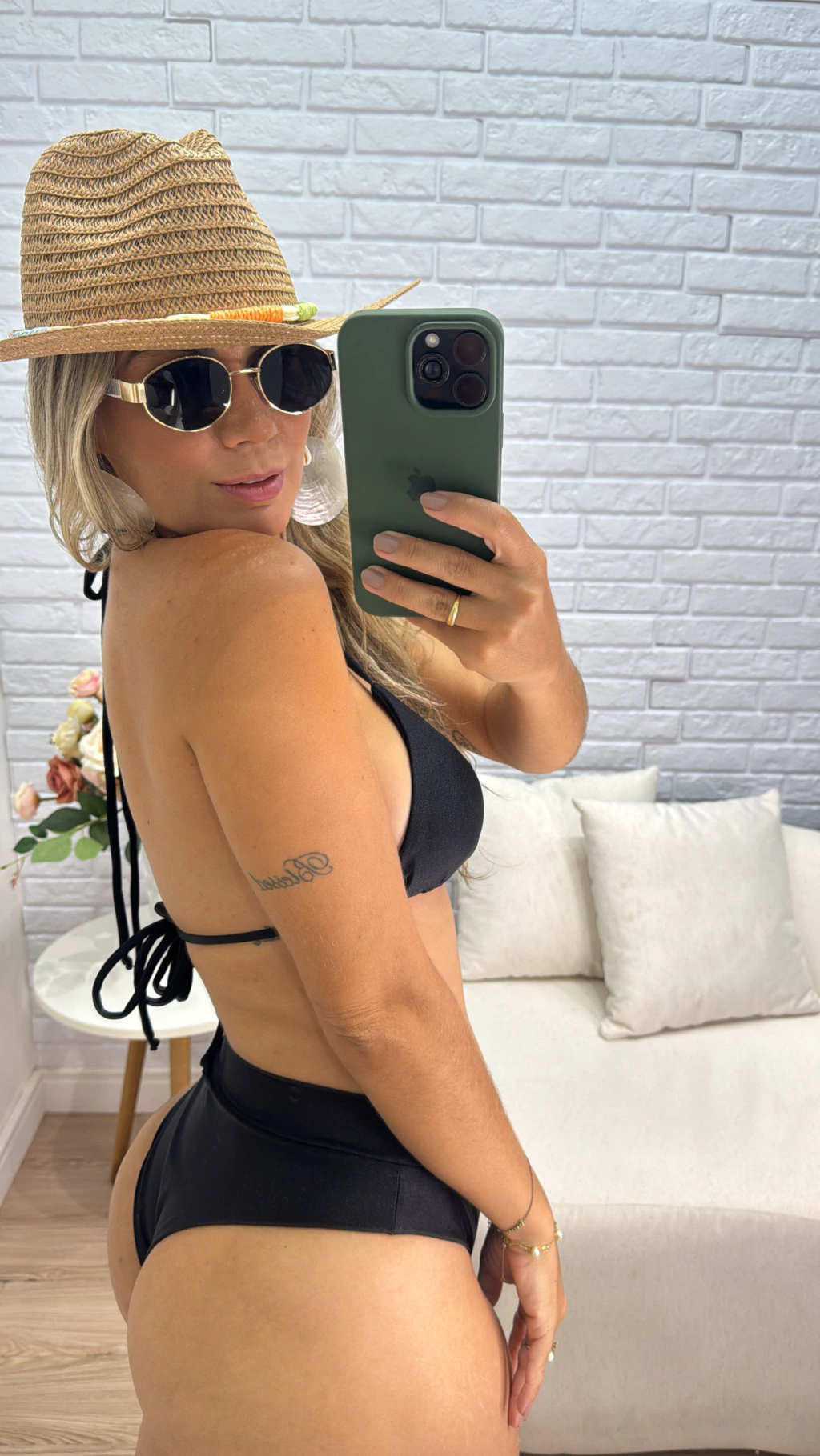 Malha Trilobal encorpada, calcinha tanguinha com cós alto, top cortininha com bojo removível e amarração nas costas e pescoço.