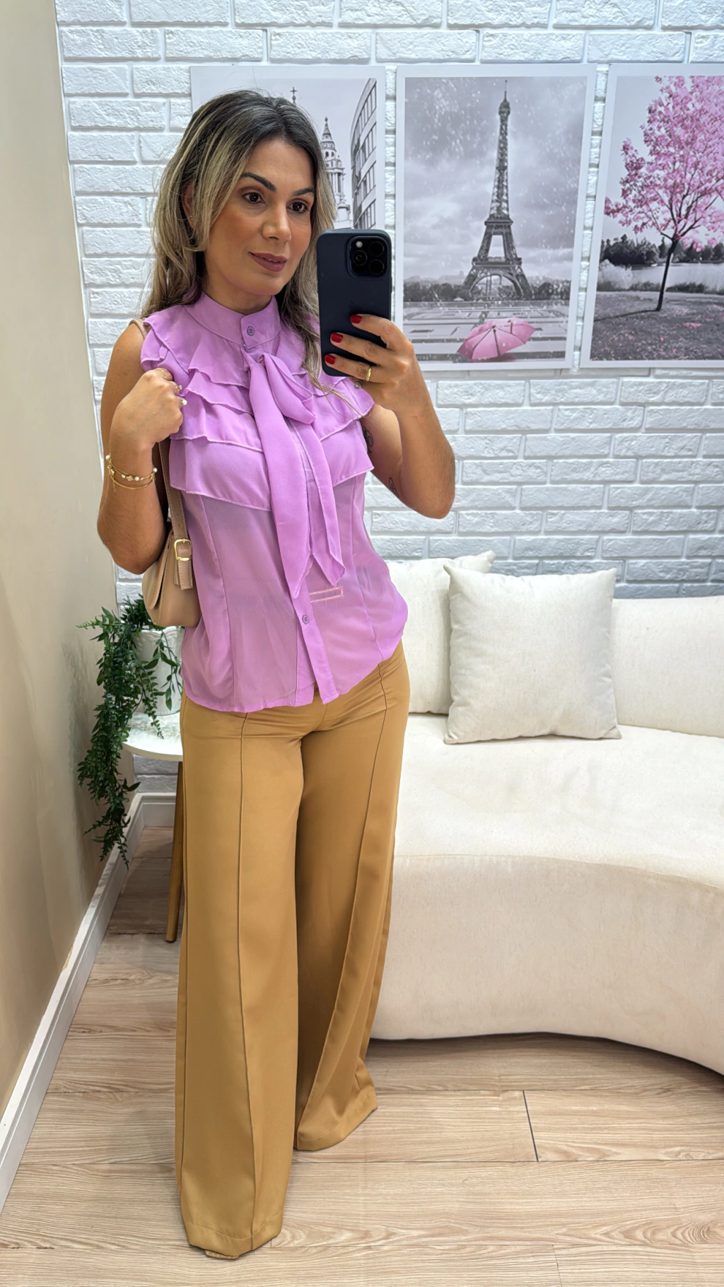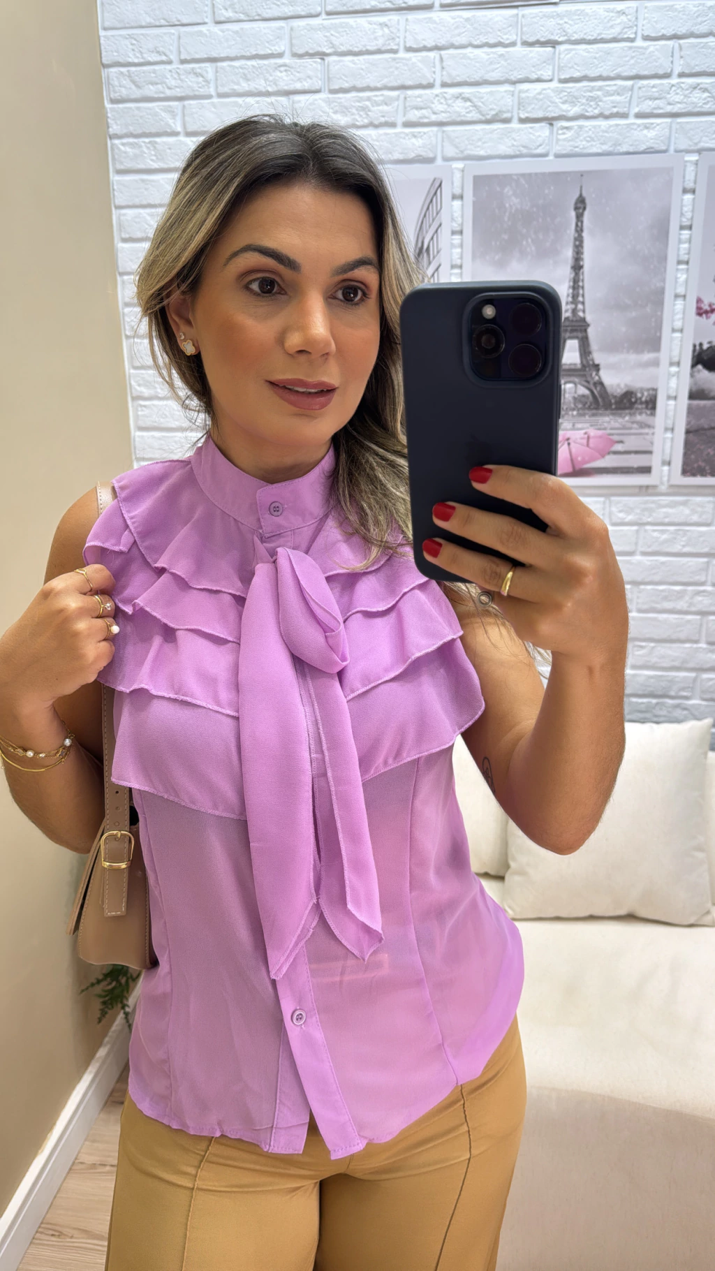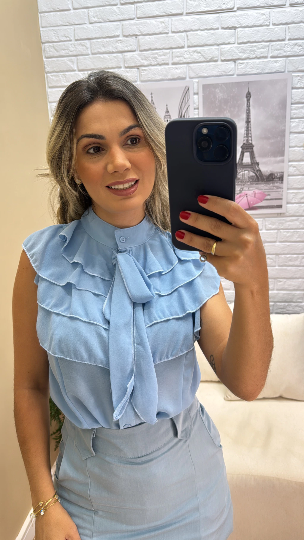 A Blusa Dura Babado é feita em chifon leve e possui detalhes delicados em babado, trazendo um toque feminino e sofisticado. Conta com botões frontais que permitem abrir e fechar com facilidade, além de uma faixa para amarração que garante ajuste perfeito à silhueta. Com modelagem regata e comprimento excelente, é ideal para diversas ocasiões, combinando conforto e estilo em uma única peça.