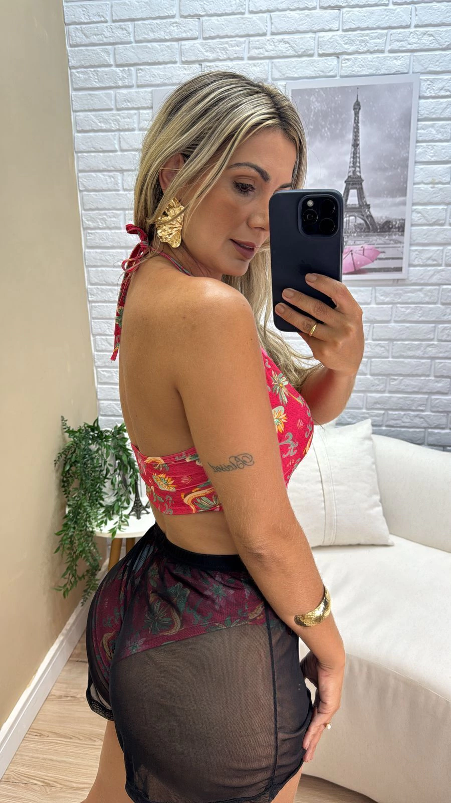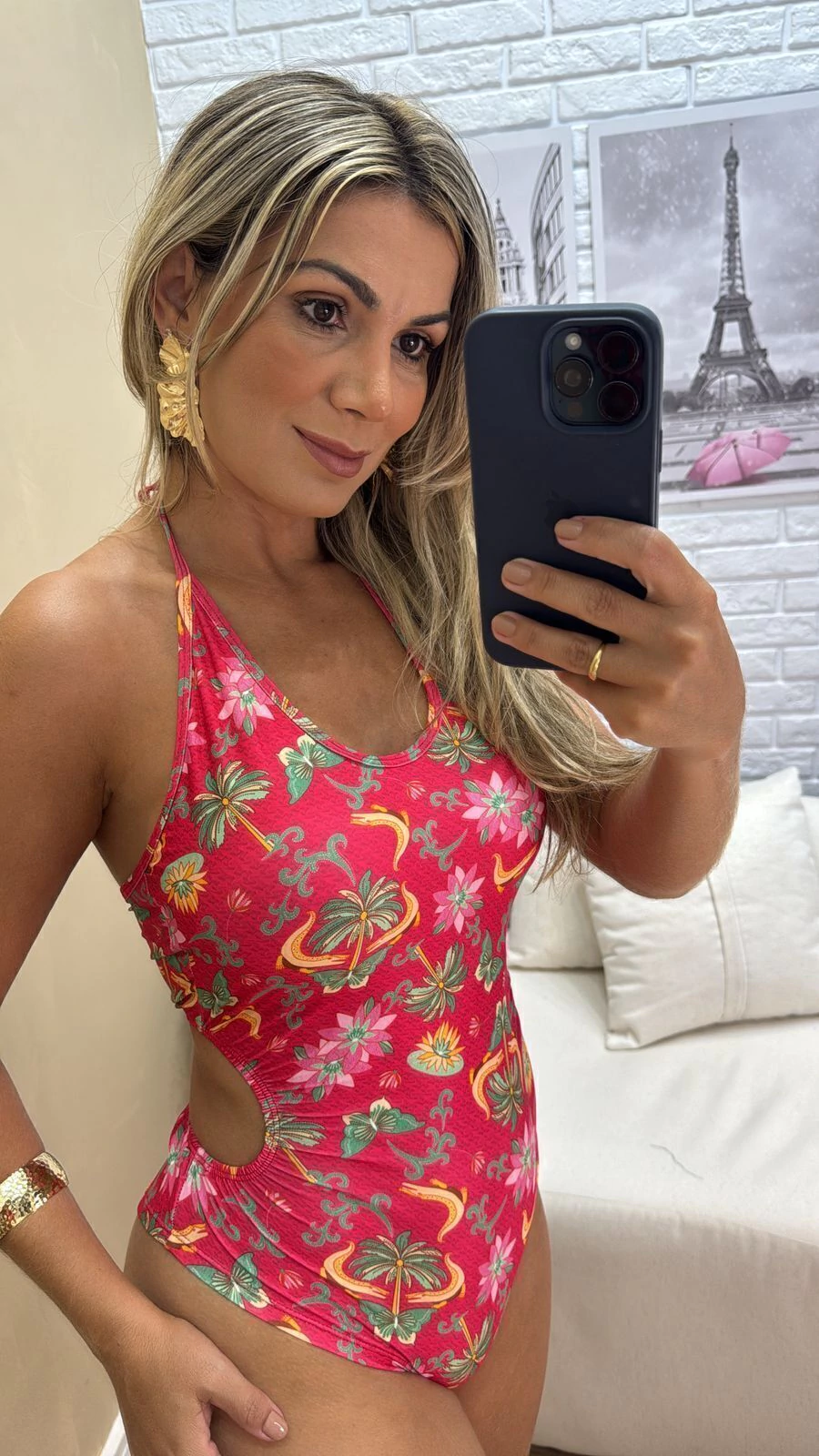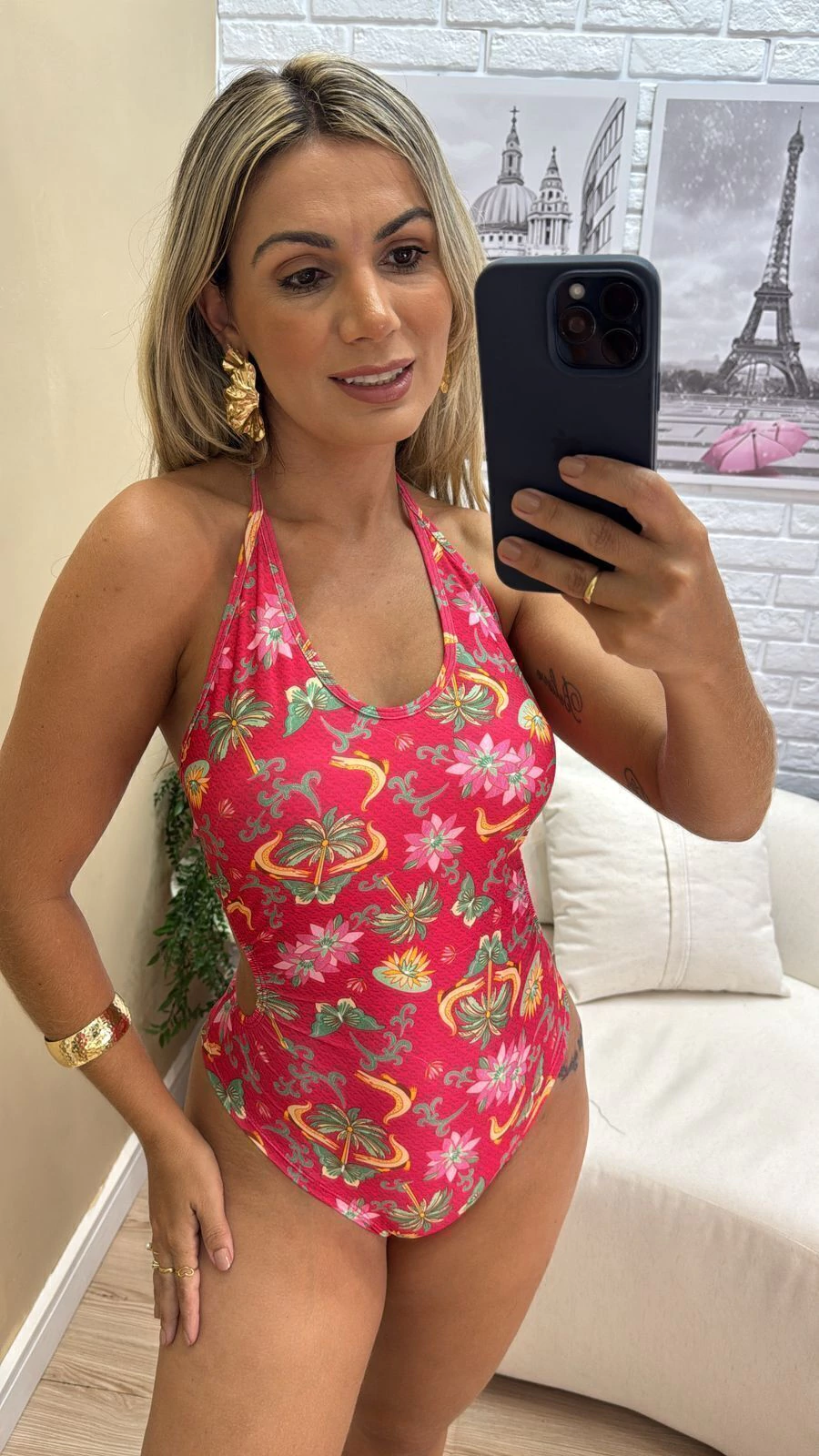Seu design apresenta um decote em U que valoriza o colo, enquanto a abertura nas costas com recortes e a amarração no pescoço garantem um toque moderno e sensual. O modelo tanguinha completa o visual, proporcionando um caimento que destaca as curvas com delicadeza.