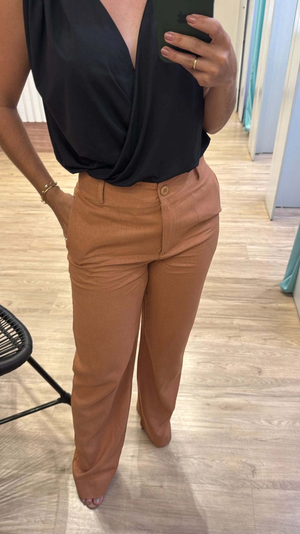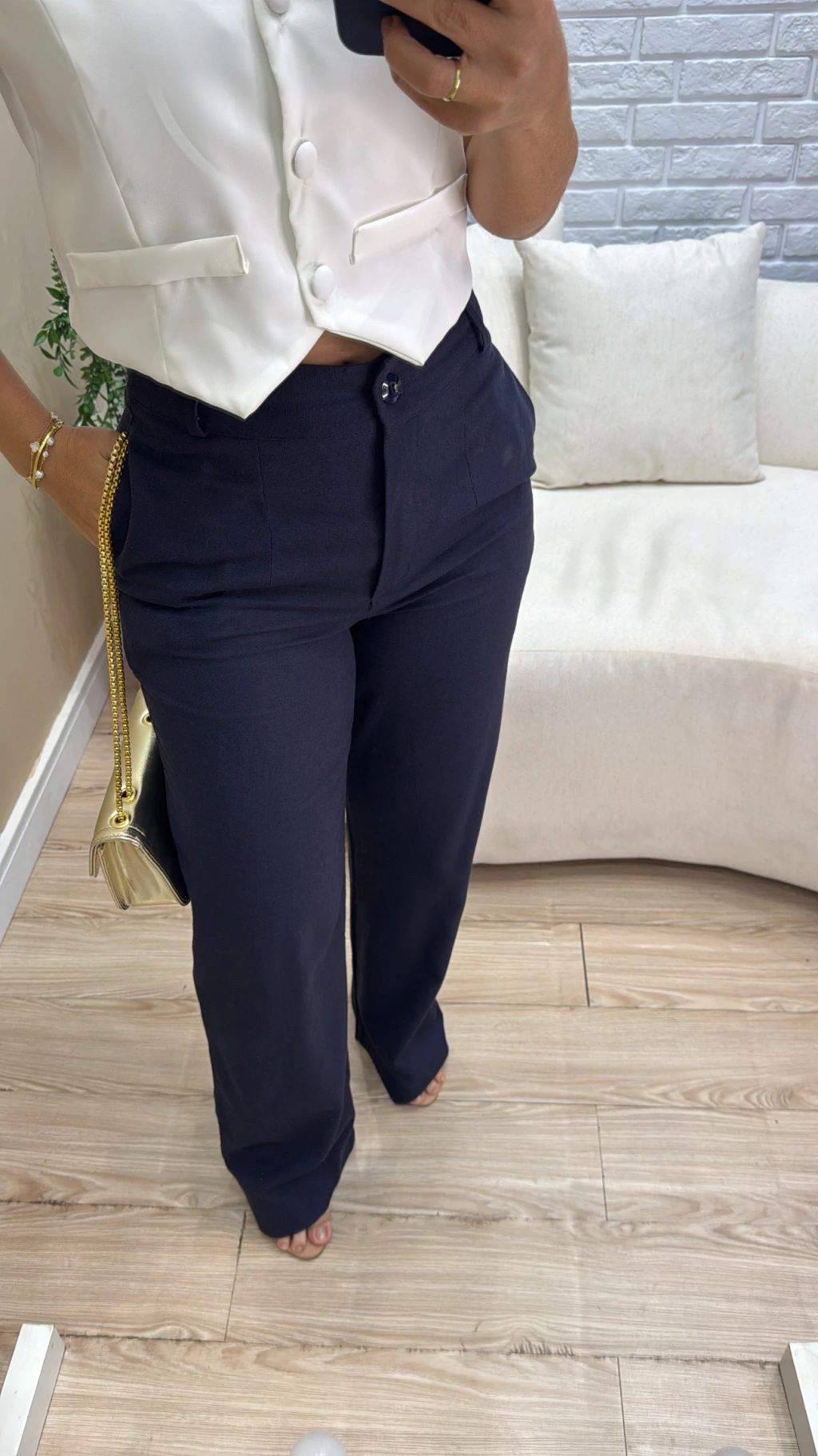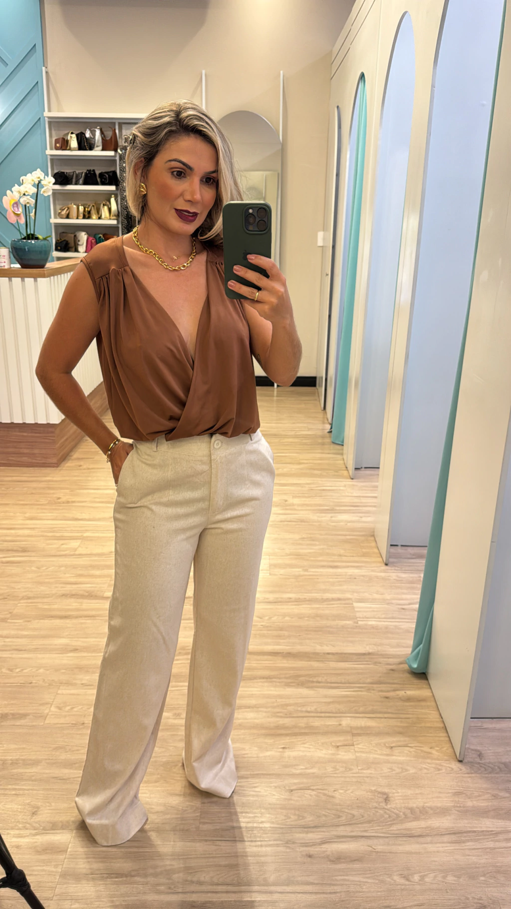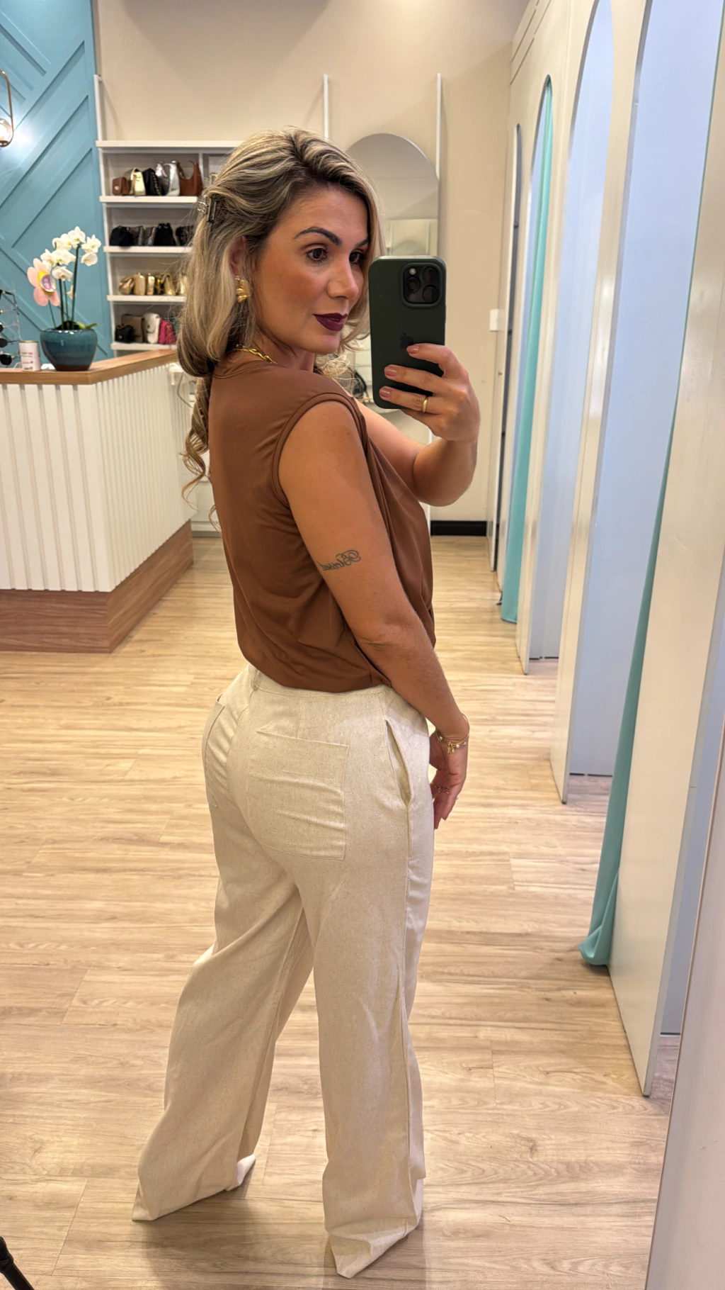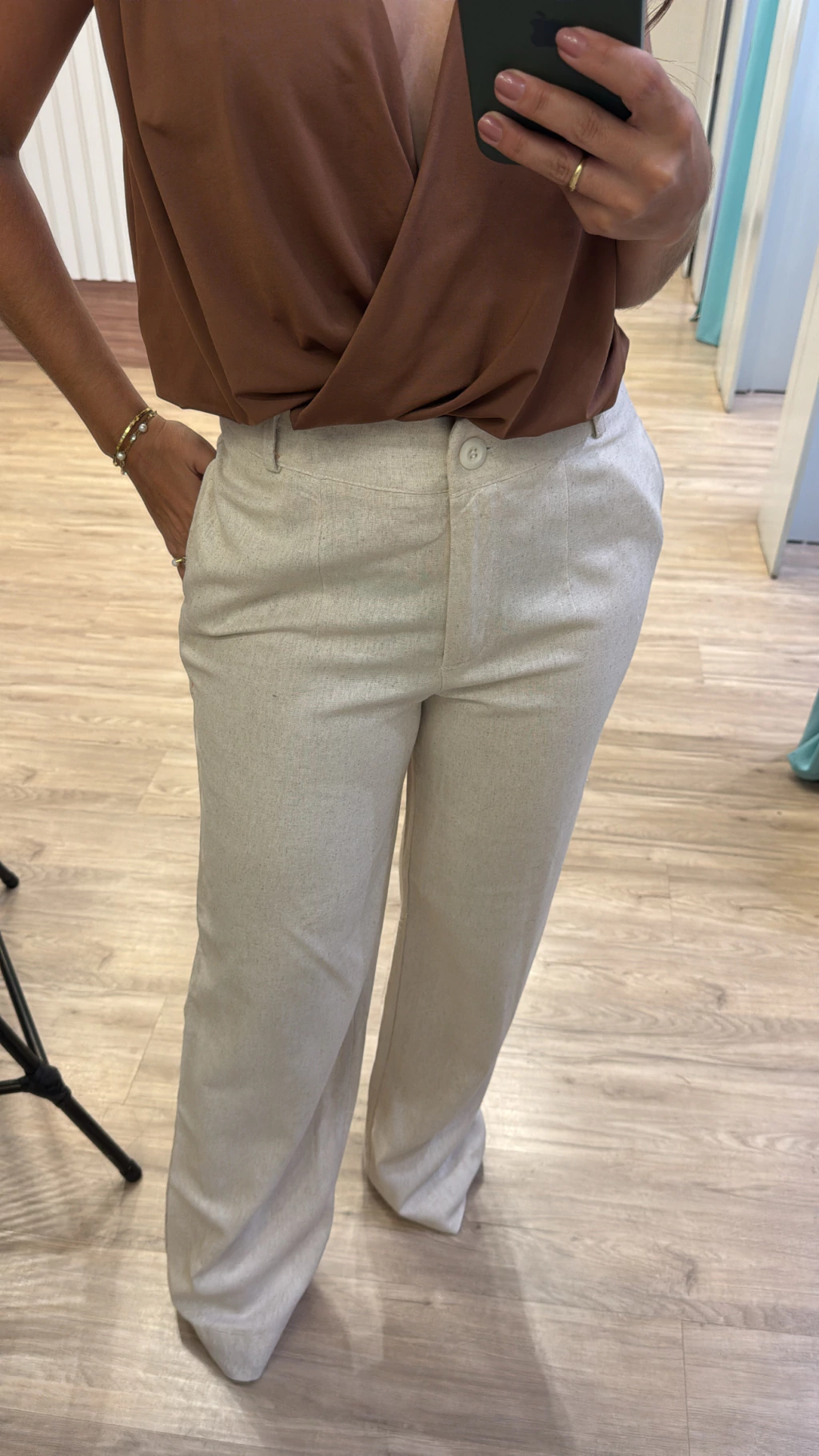 Em linho, leve, fresca, cós alto, bolsos invisíveis lateral, bolsos nas costas, comprimento alongado, ideal para mulheres alta.