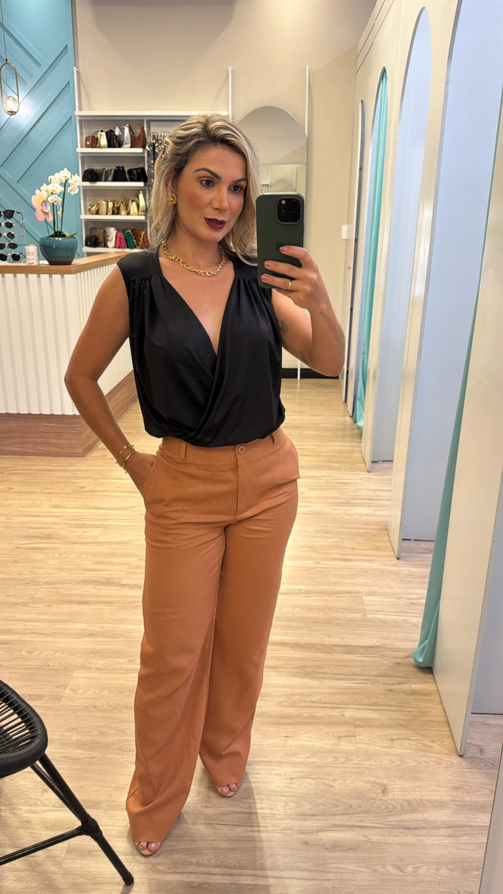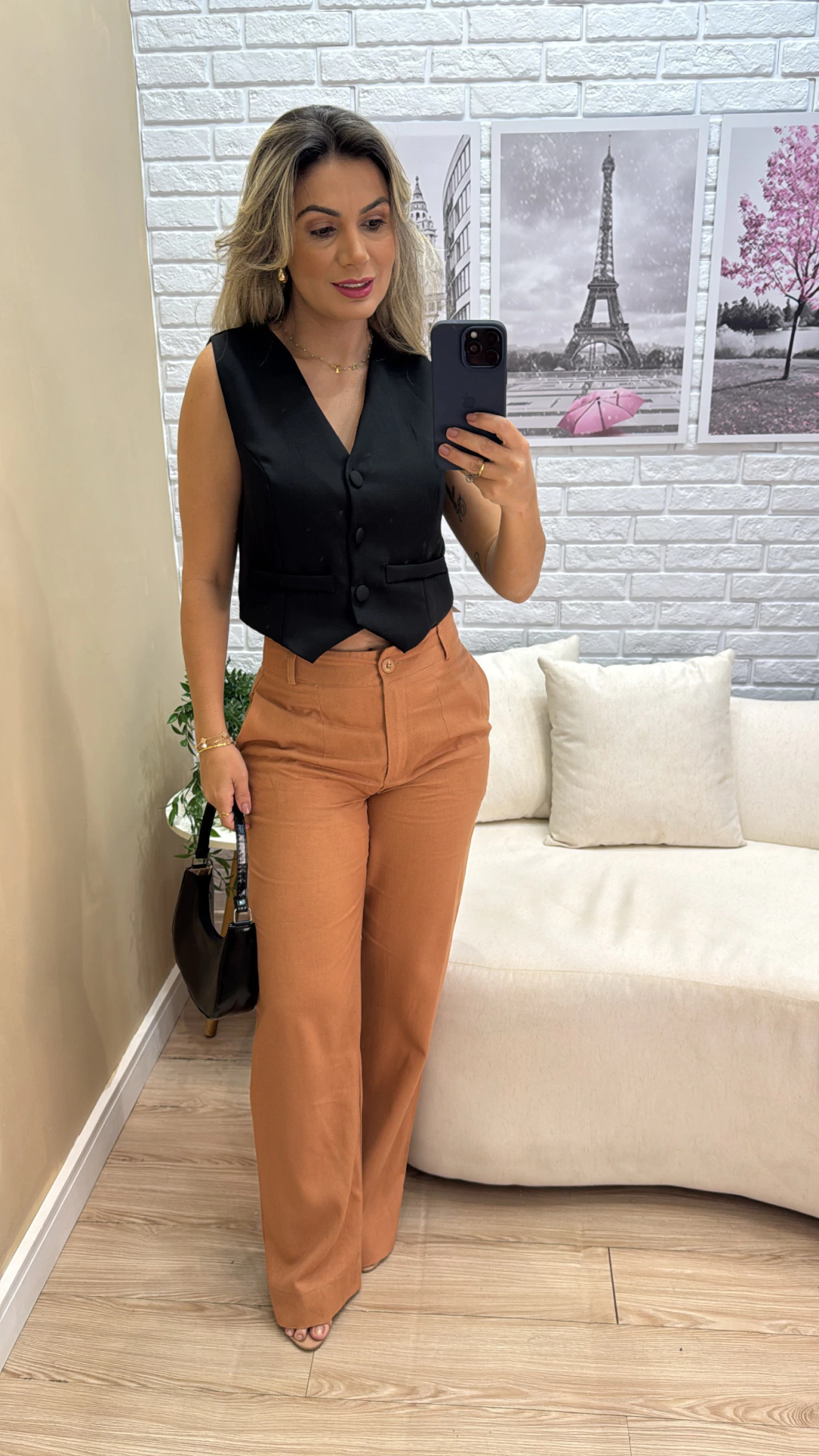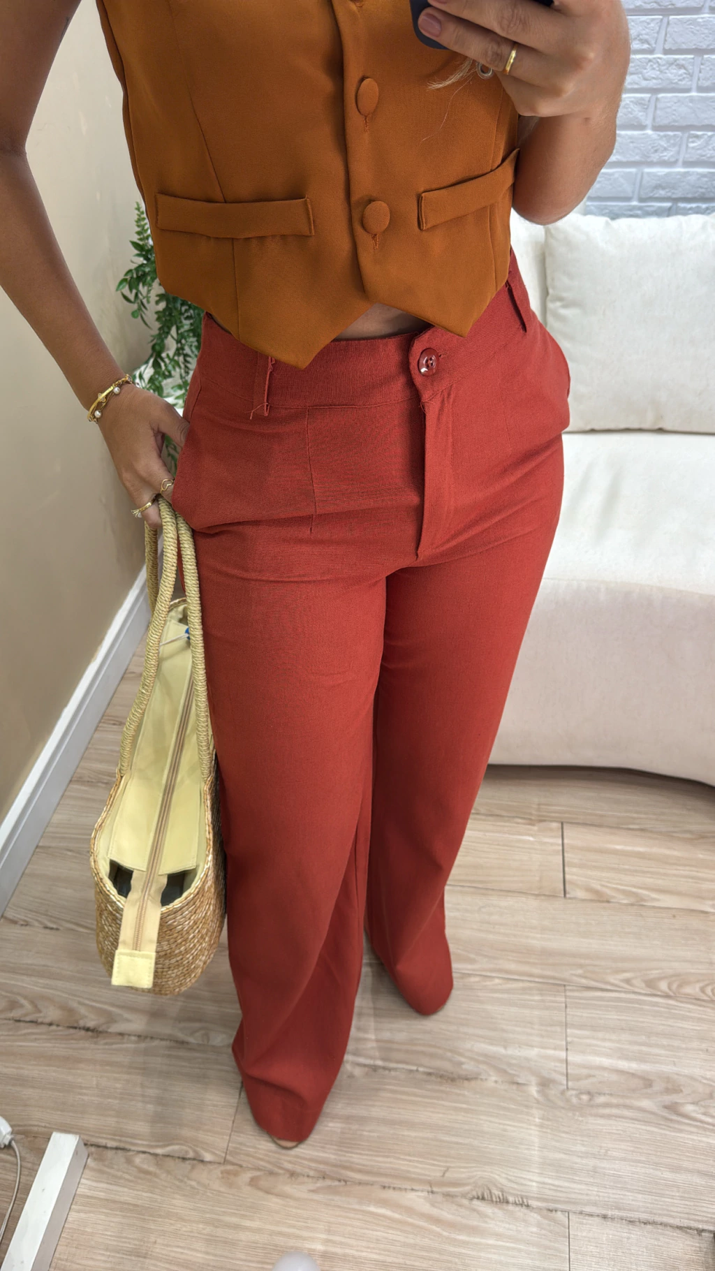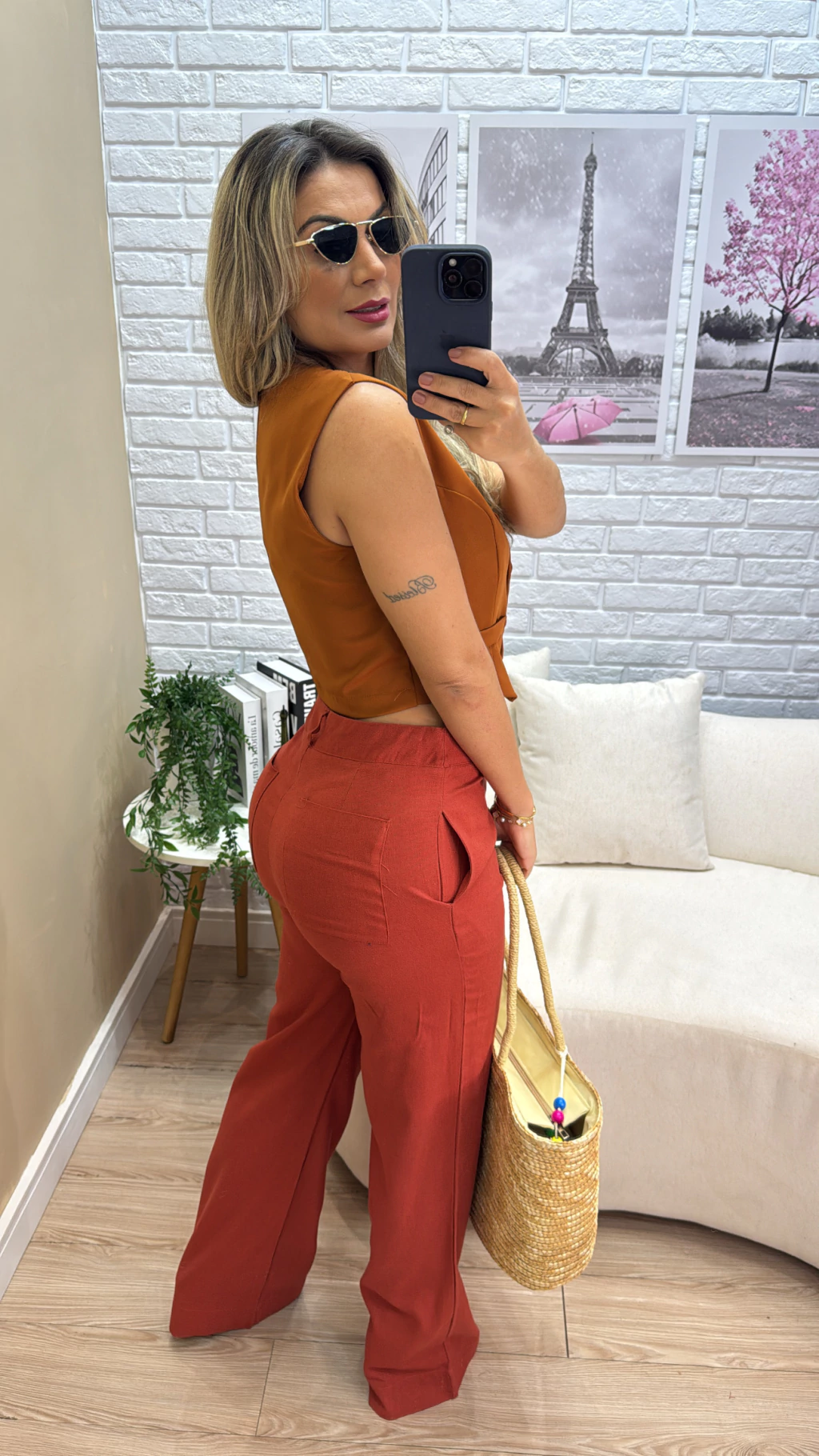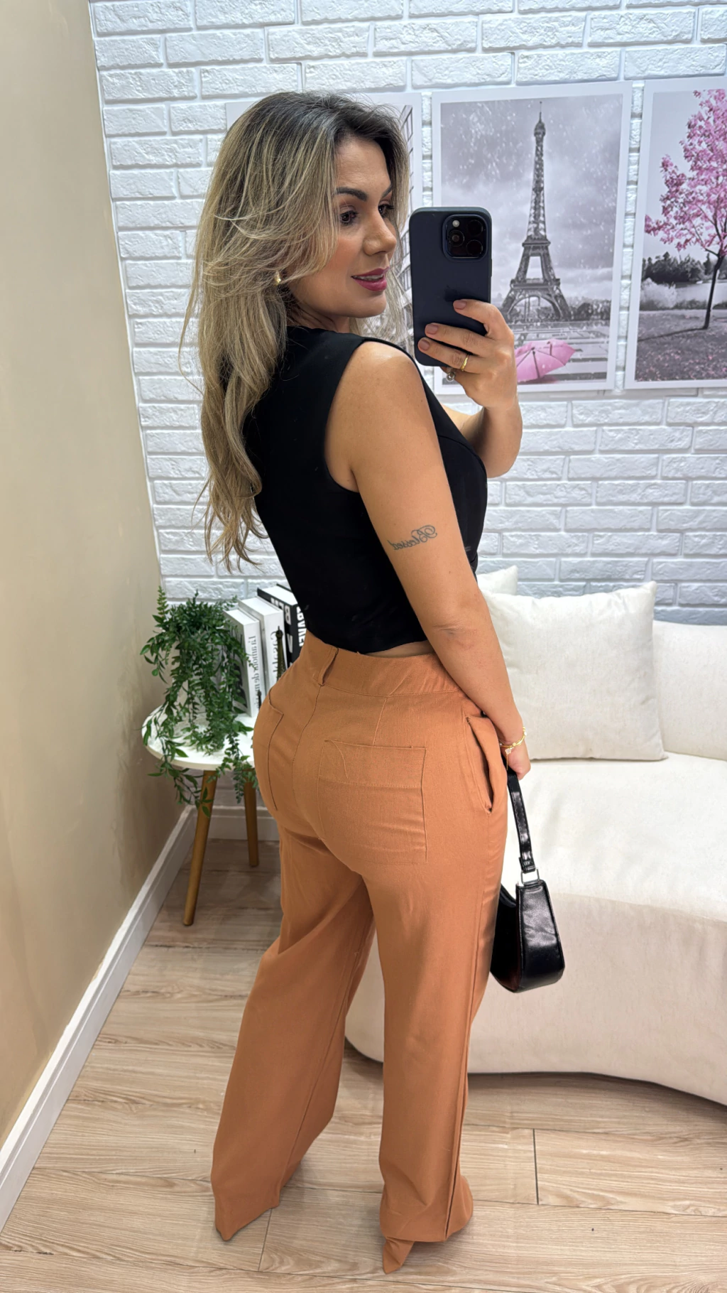 Em linho, leve, fresca, cós alto, bolsos invisíveis lateral, bolsos nas costas, comprimento alongado, ideal para mulheres alta.