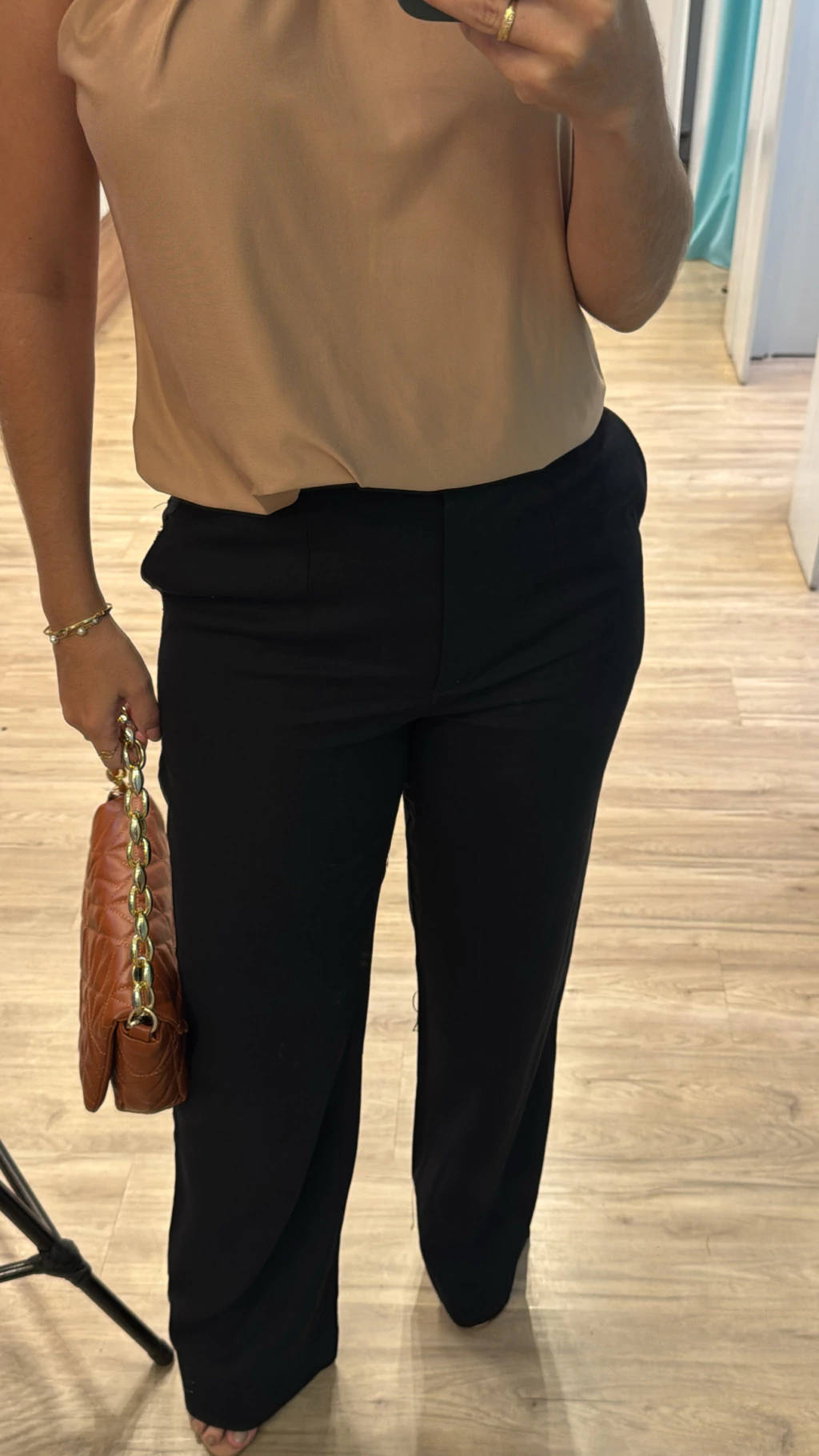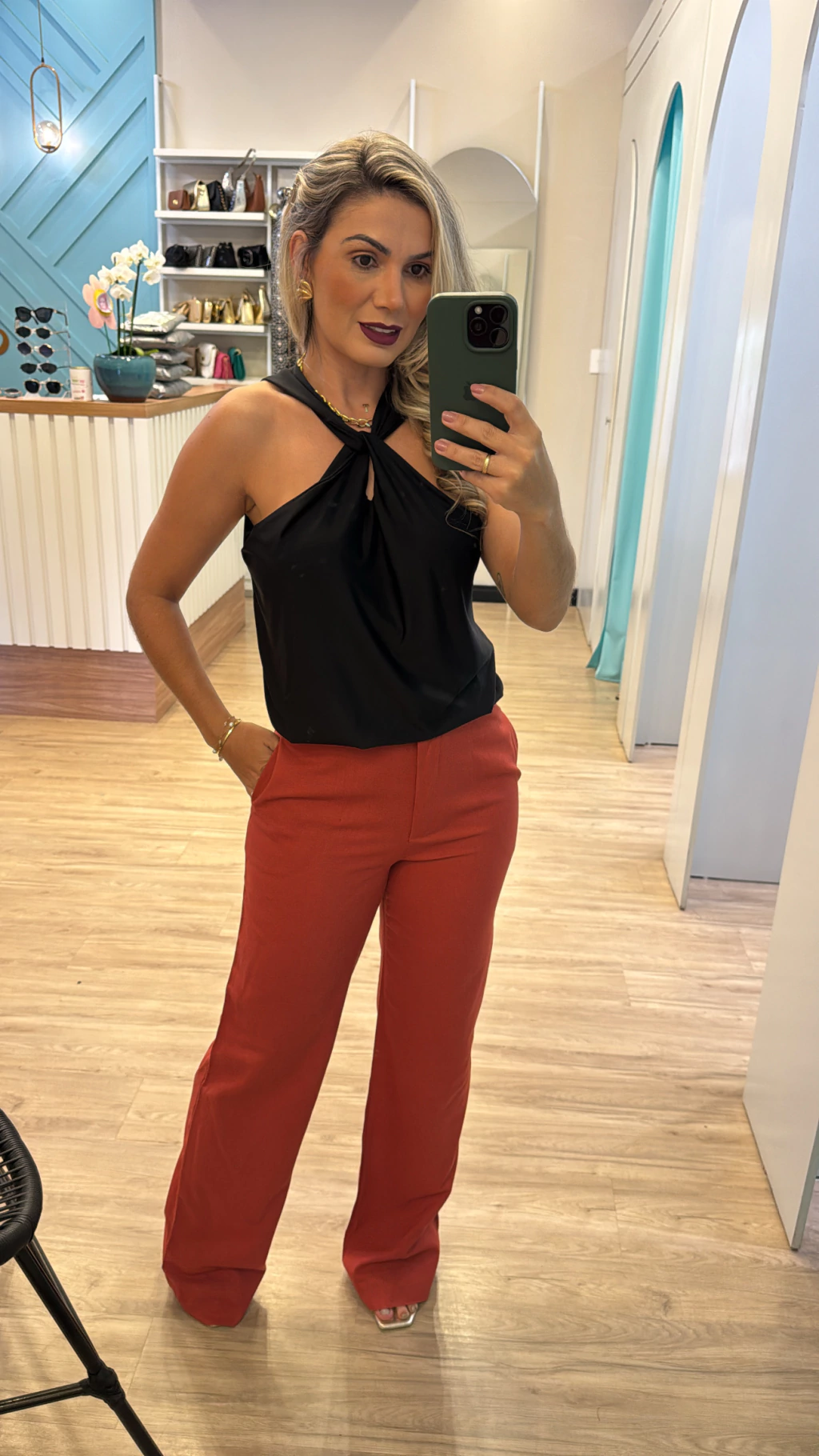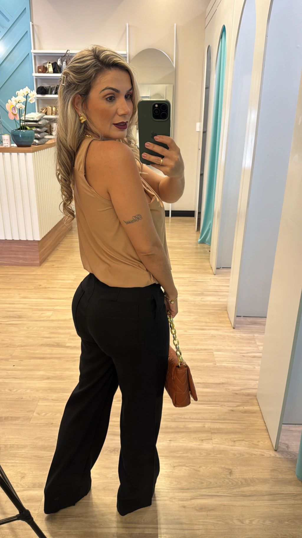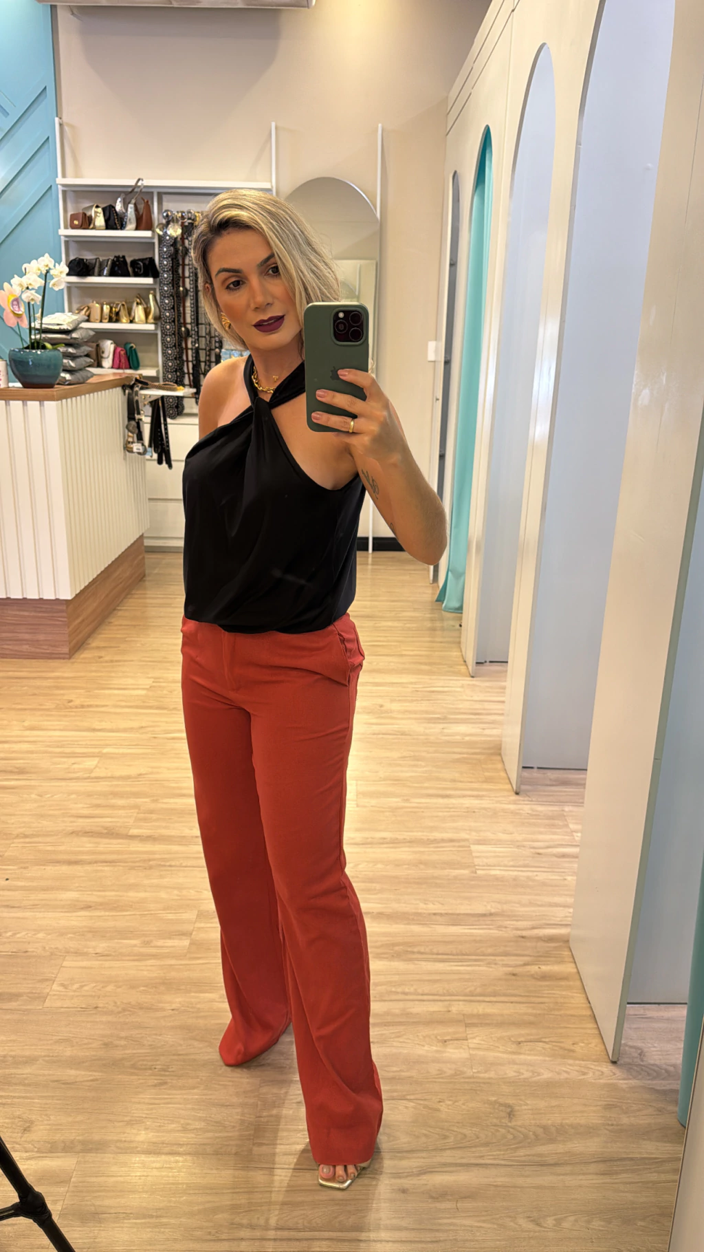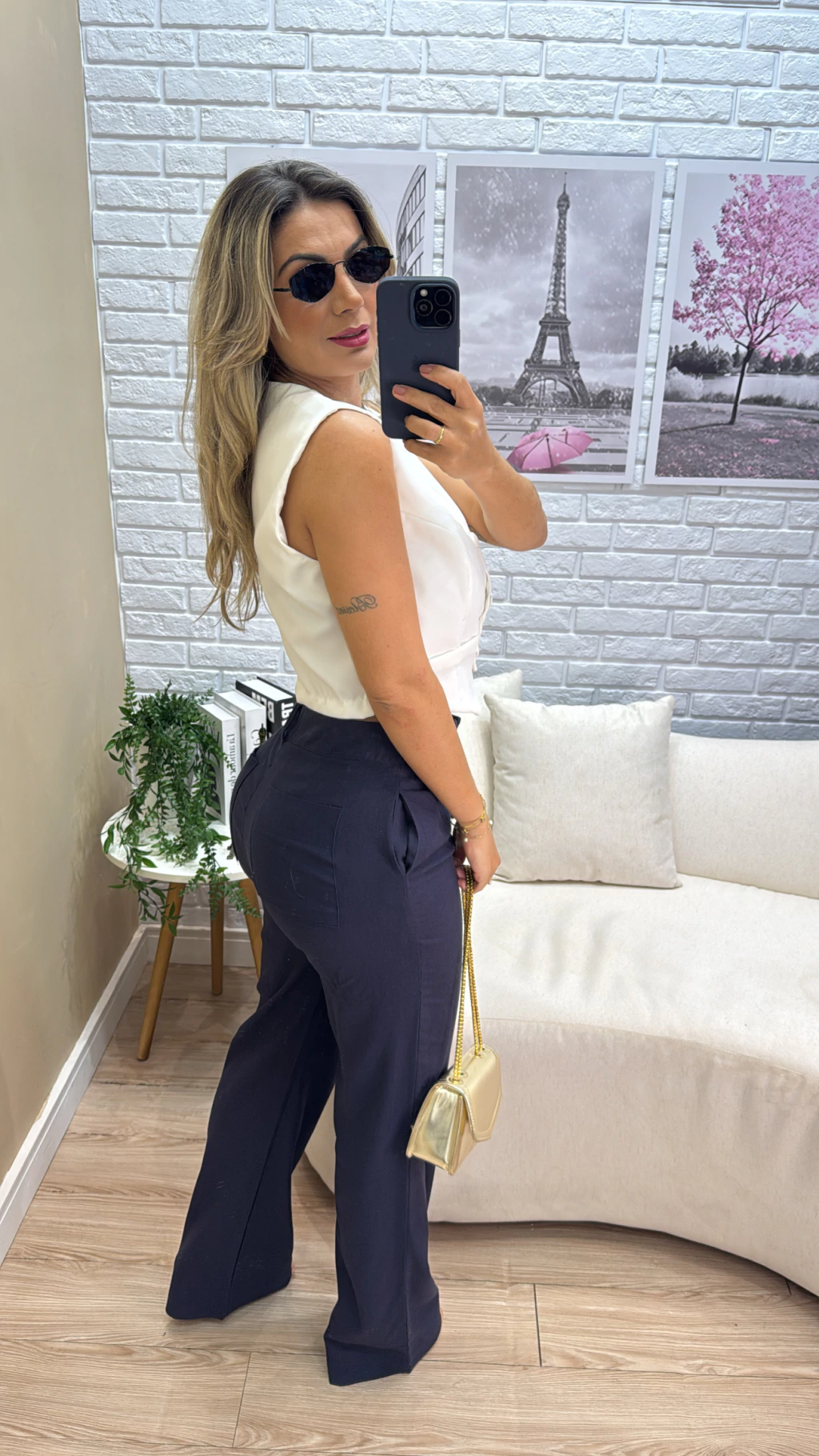 Em linho, leve, fresca, cós alto, bolsos invisíveis lateral, bolsos nas costas, comprimento alongado, ideal para mulheres alta.
