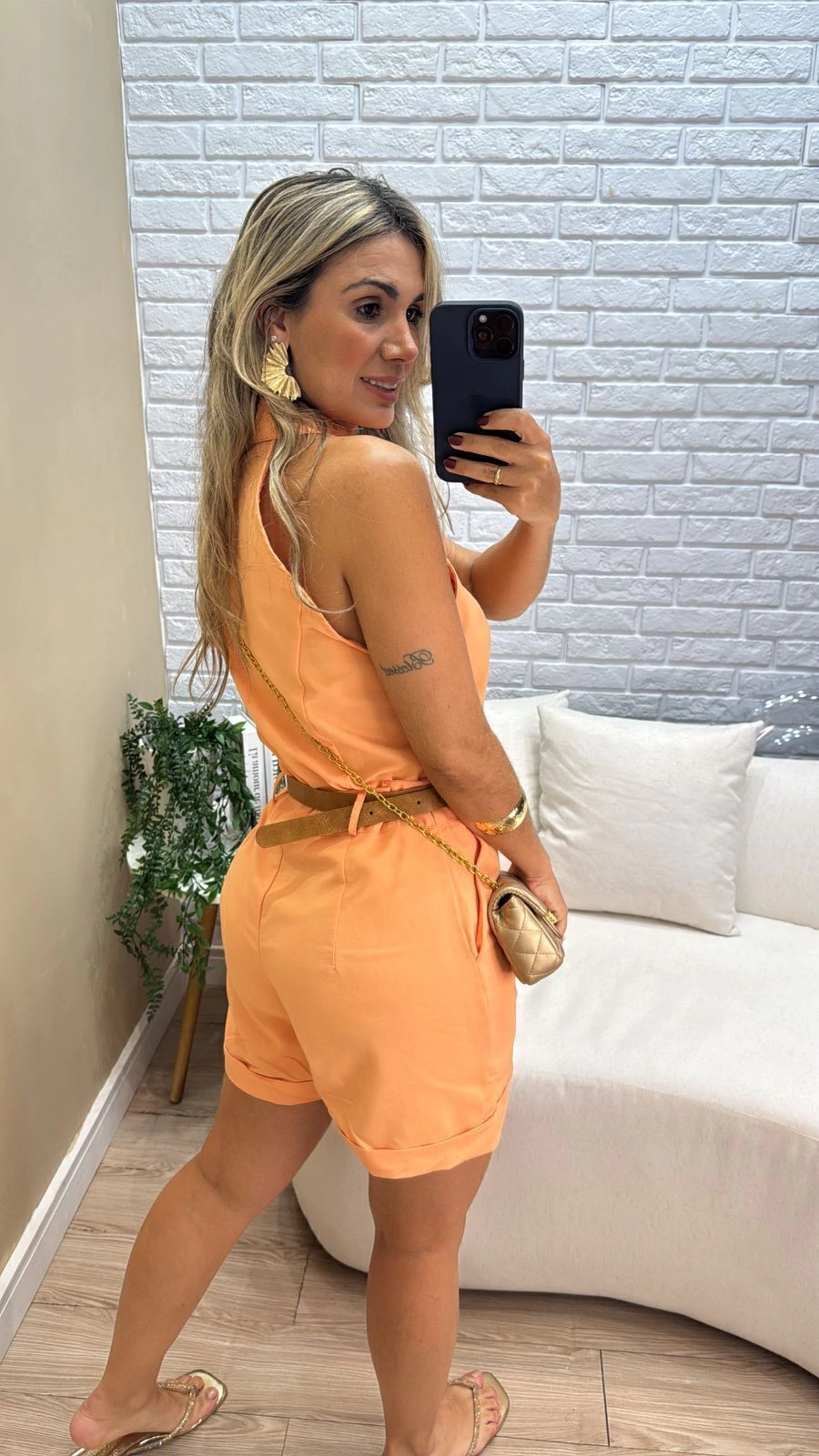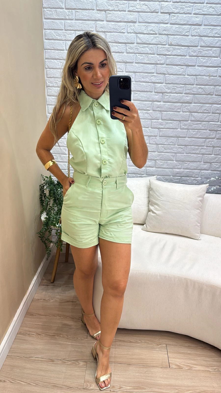 A blusa colete apresenta um design moderno com botões frontais, agregando praticidade e estilo ao visual. Já o shorts bermuda conta com passante e cós ajustado, além do bolso com corte faca, que proporciona funcionalidade sem perder a elegância.