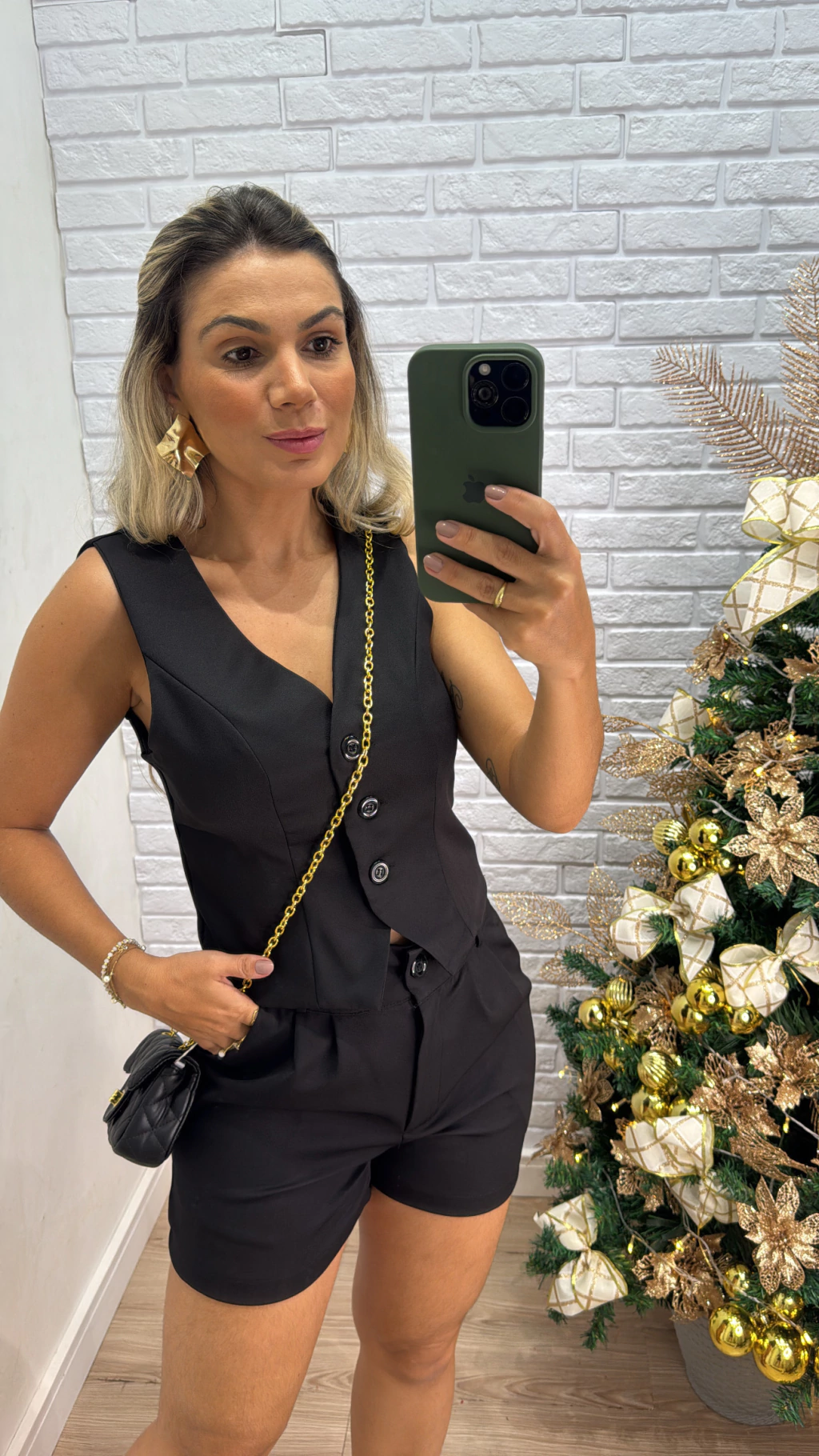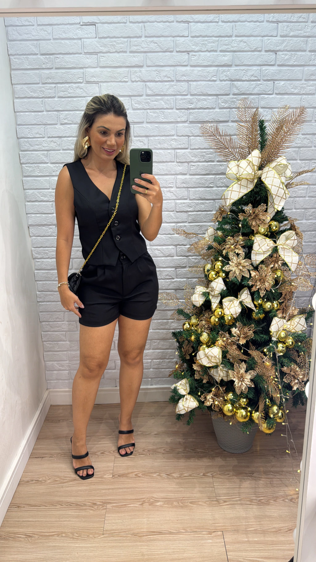 Tecido Twill, acompanha colete com botões e shorts cós alto, bolsos laterais, detalhes de prega, tamanho corresponde seu real tamanho. Veste P(36/38) M(40) G(42).