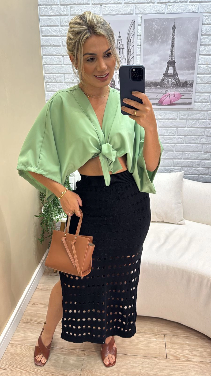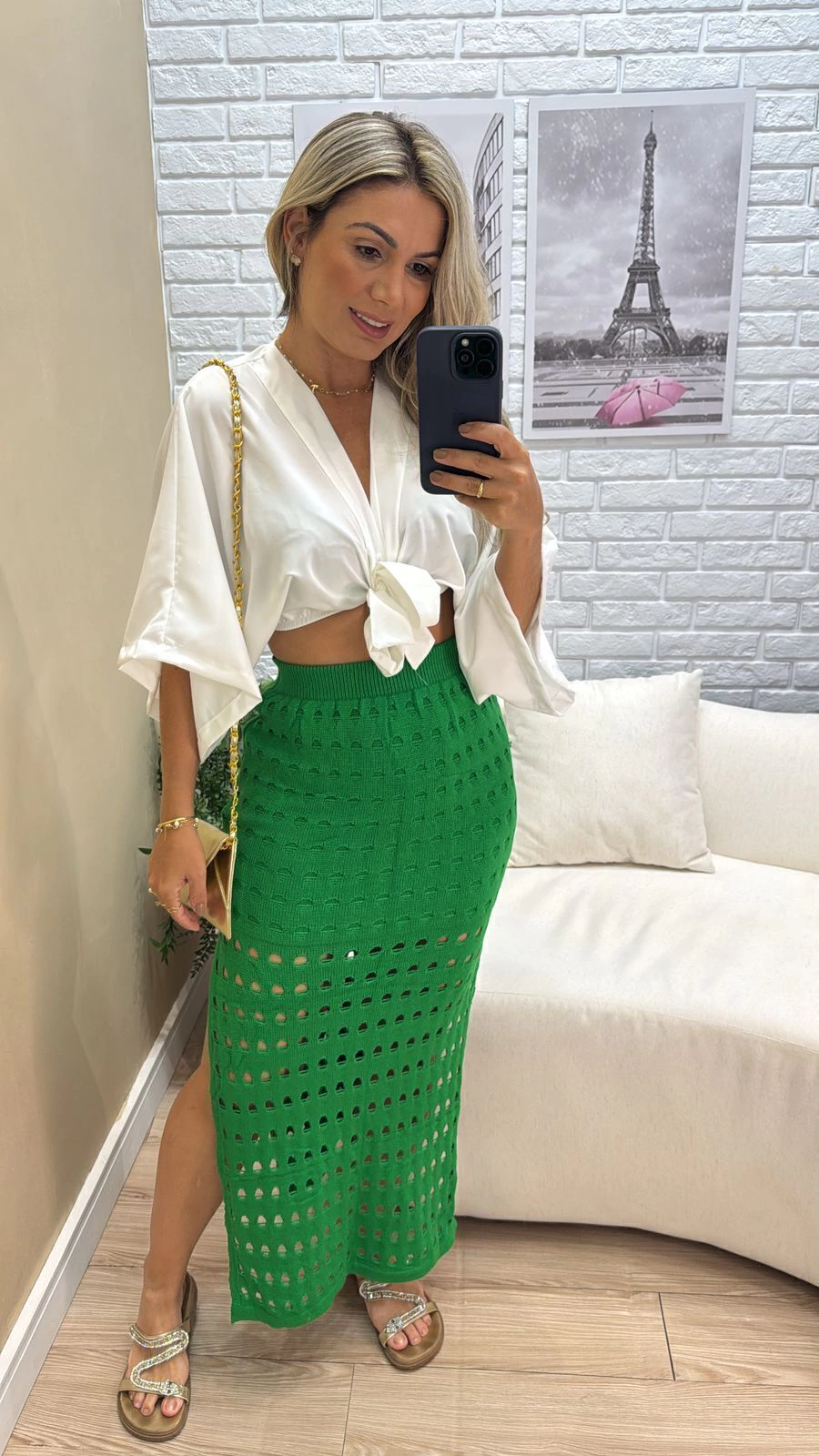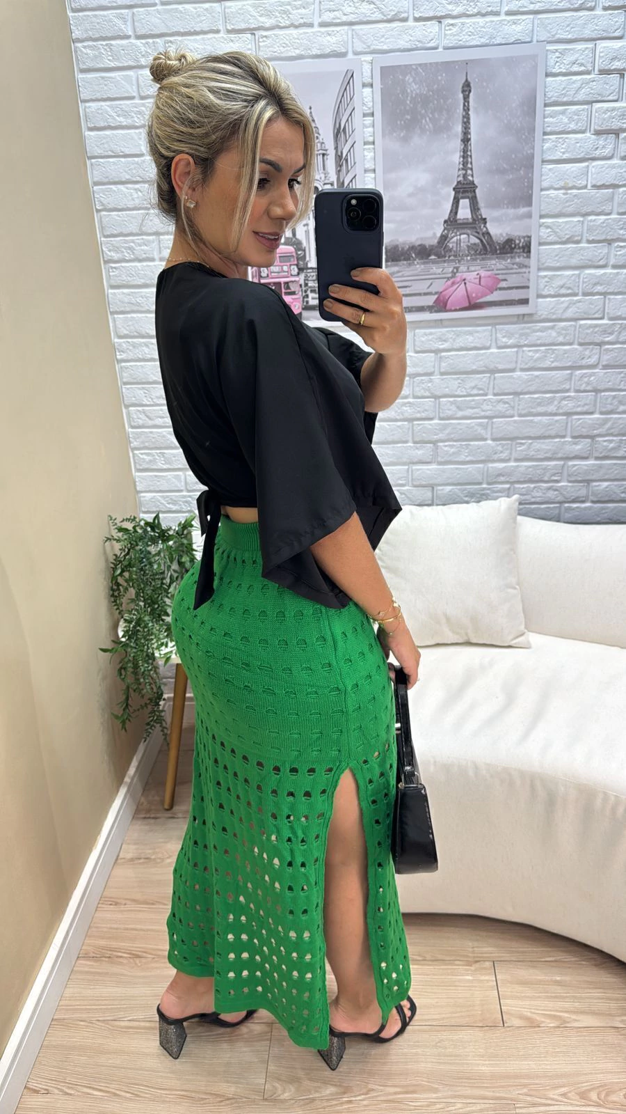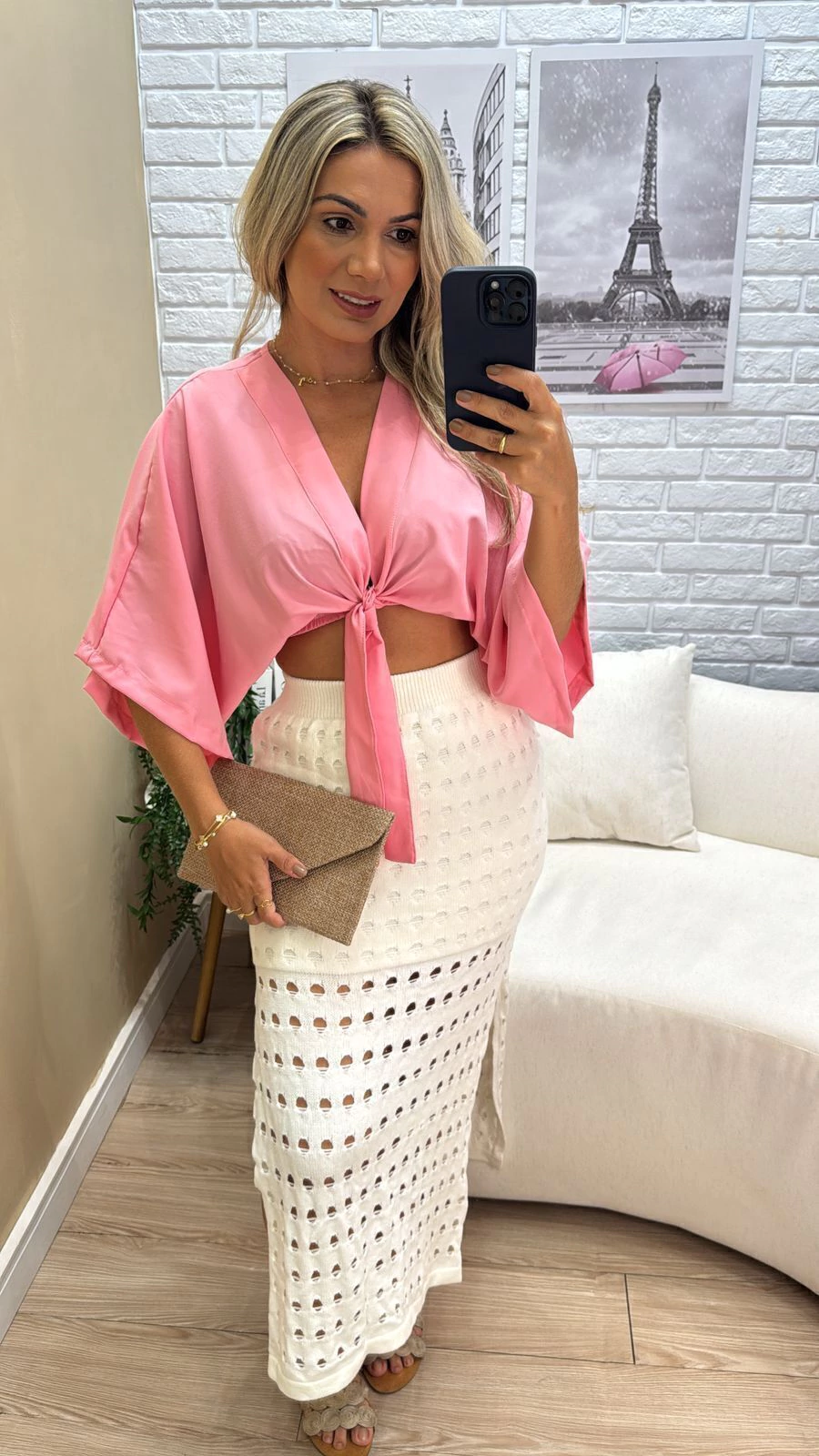 O Cropped Alicia é confeccionado em crepe fluith, um tecido leve e com excelente movimento, ideal para quem busca conforto e estilo. Seu design moderno apresenta uma amarração na frente que oferece várias opções de ajuste, permitindo personalizar o caimento conforme sua preferência.