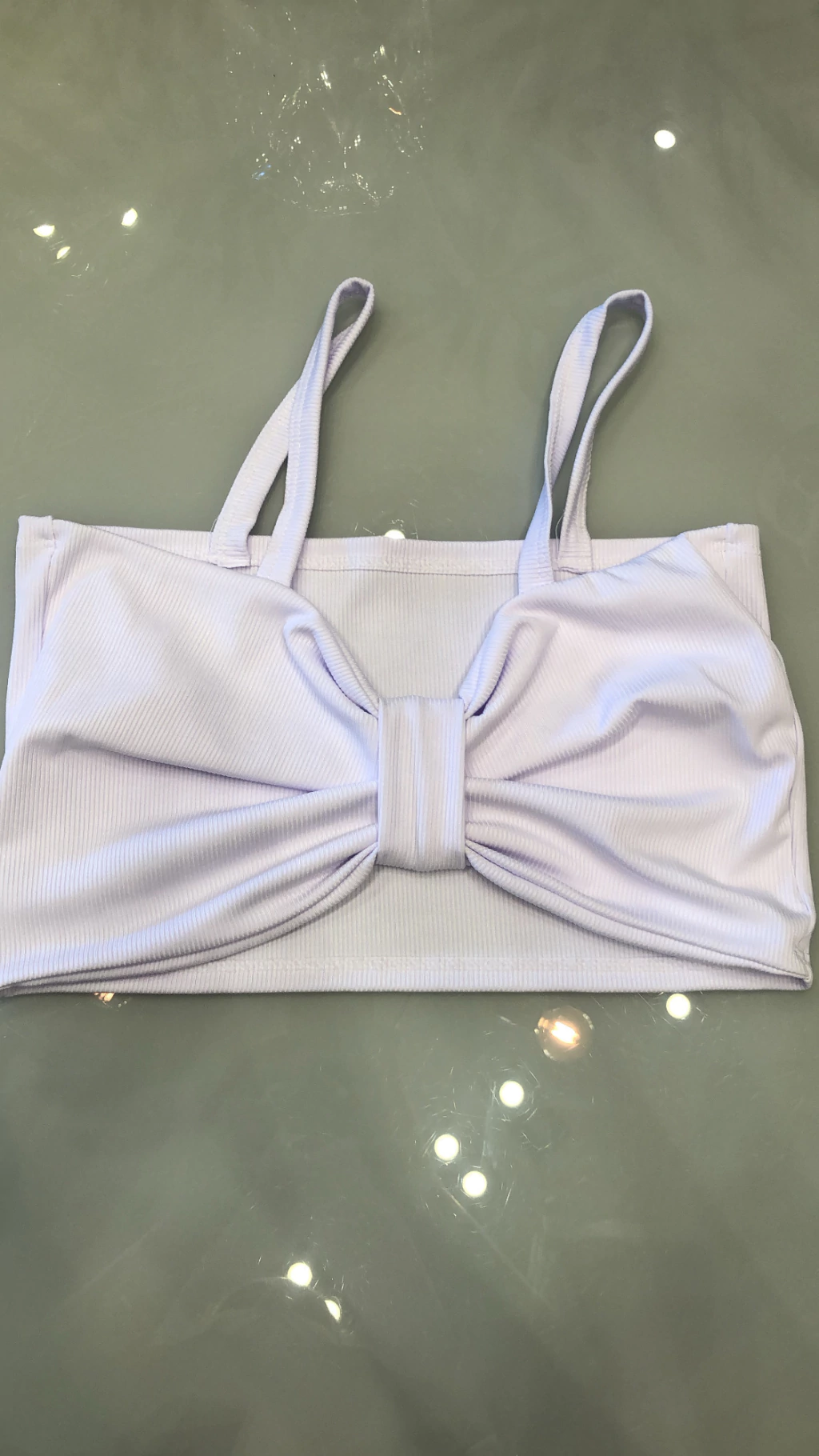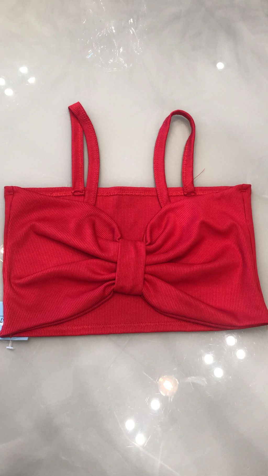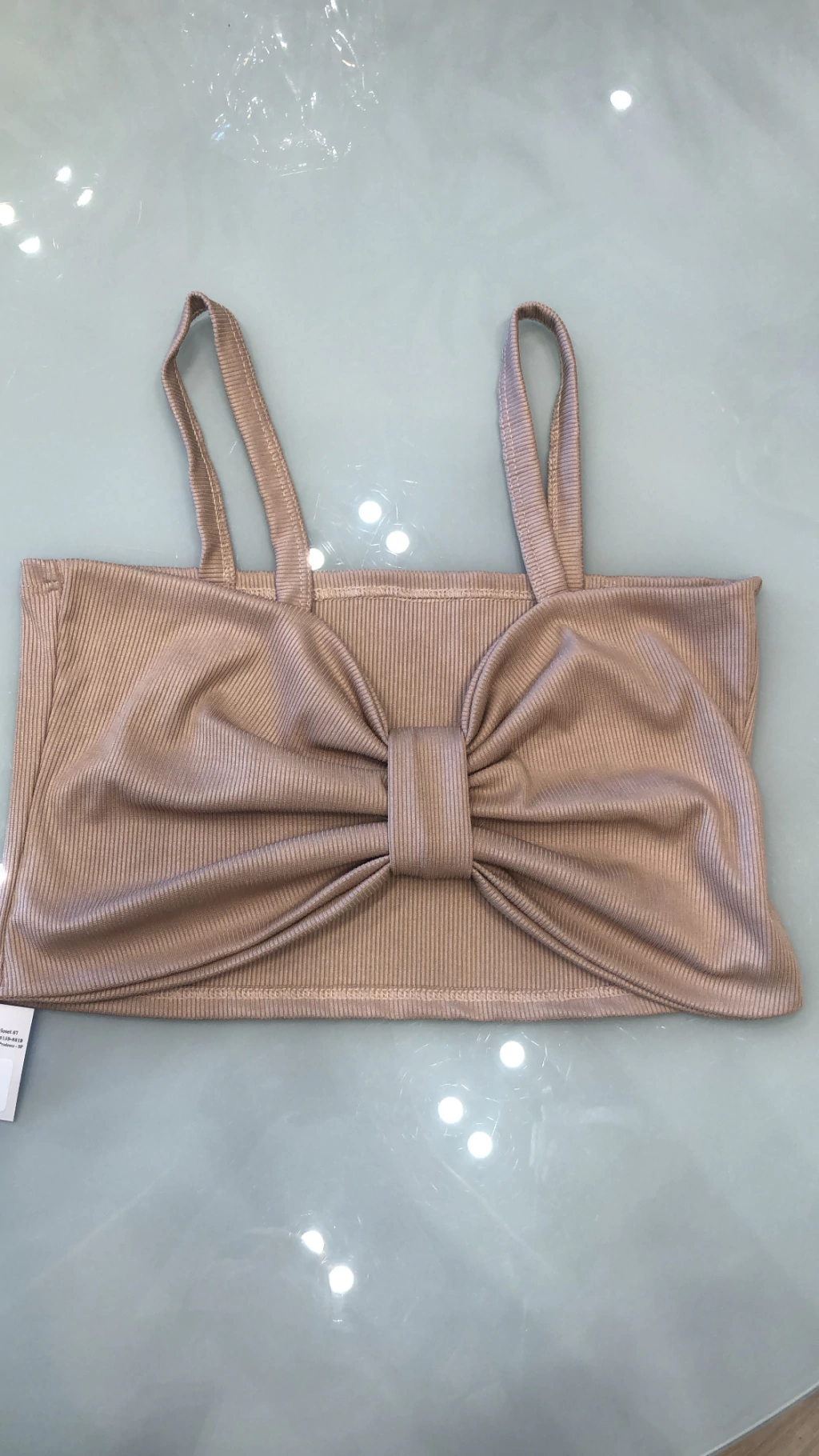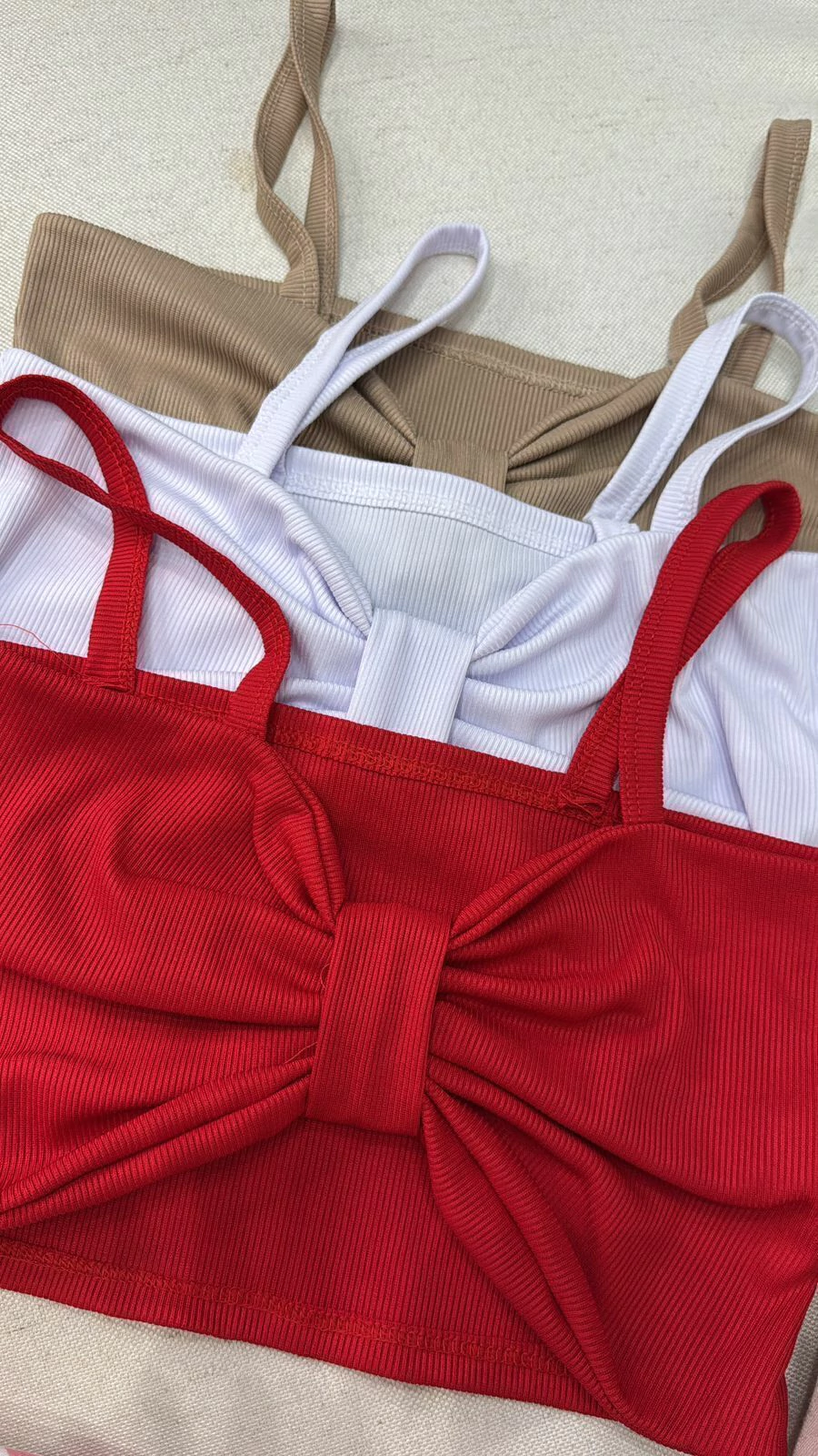 Em ribana, detalhe em laço na frente, alças finas, não possui bojo.