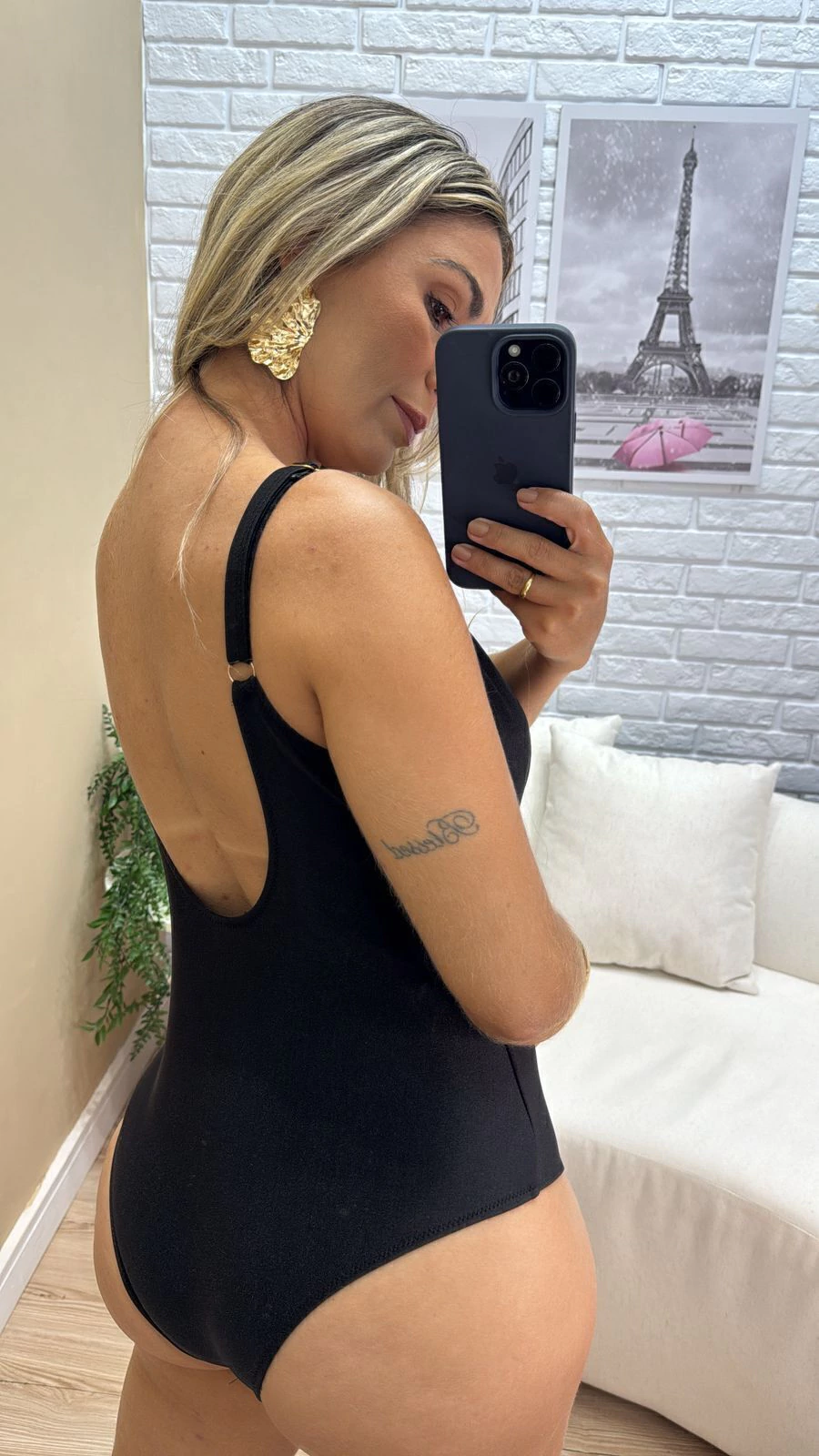 Seu design sofisticado traz um detalhe dourado em formato de U no busto, que acrescenta um toque de charme e exclusividade. As alças finas com regulagem e o decote U nas costas valorizam a silhueta, além de proporcionar um caimento perfeito.