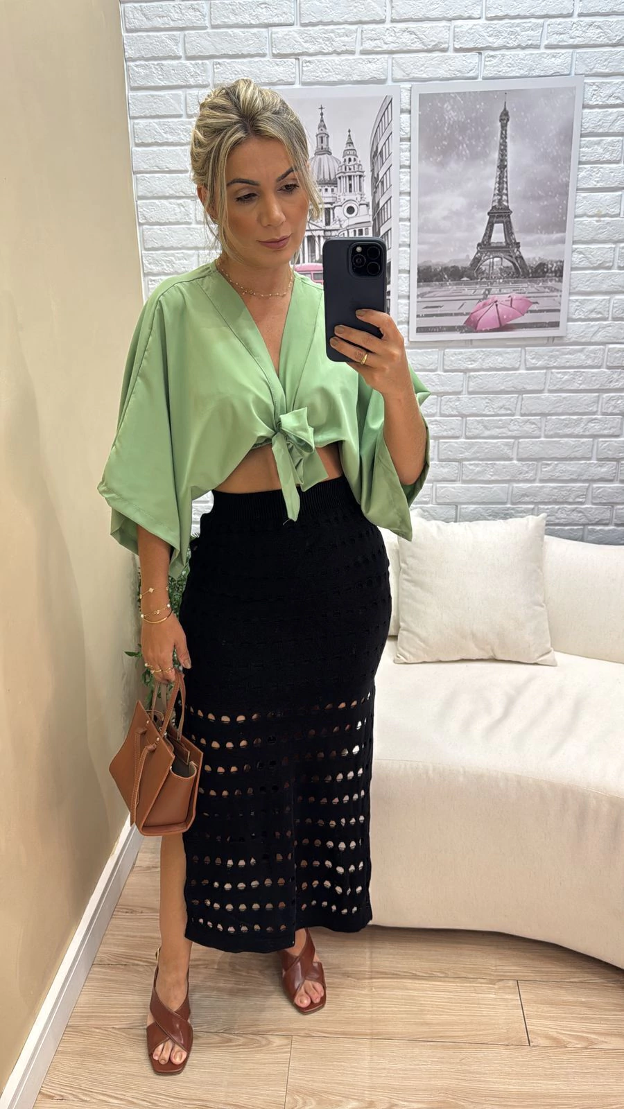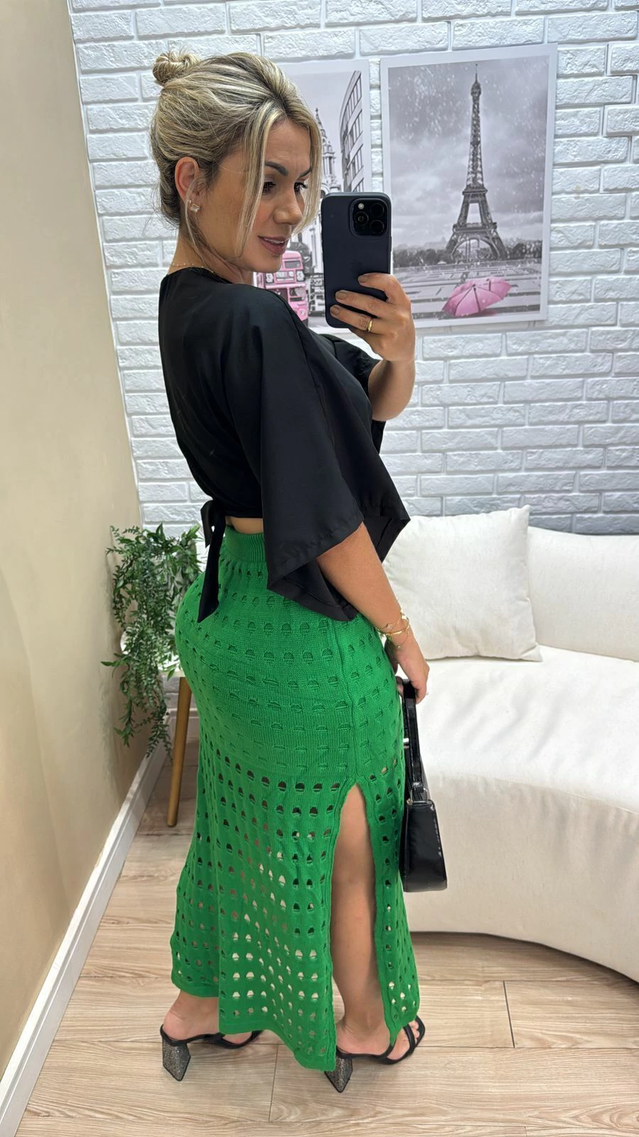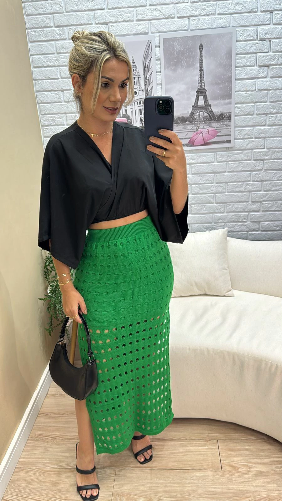 Seu design moderno conta com fendas laterais mais altas, proporcionando liberdade de movimento e um toque de sensualidade discreta. A parte de baixo da saia possui delicados vazados, que adicionam leveza e sofisticação ao visual.