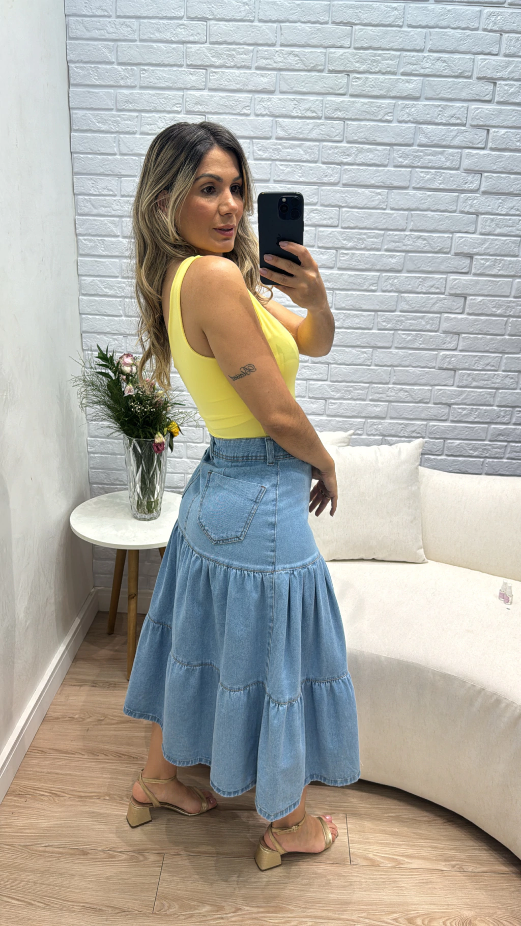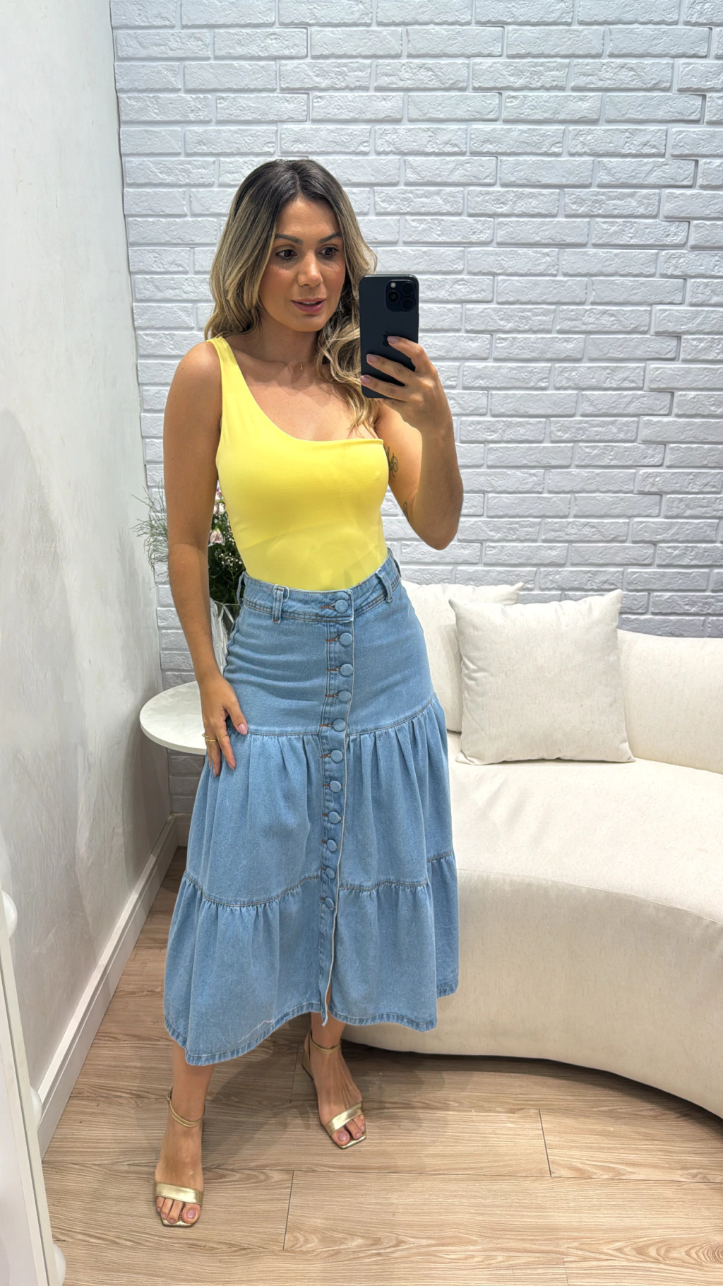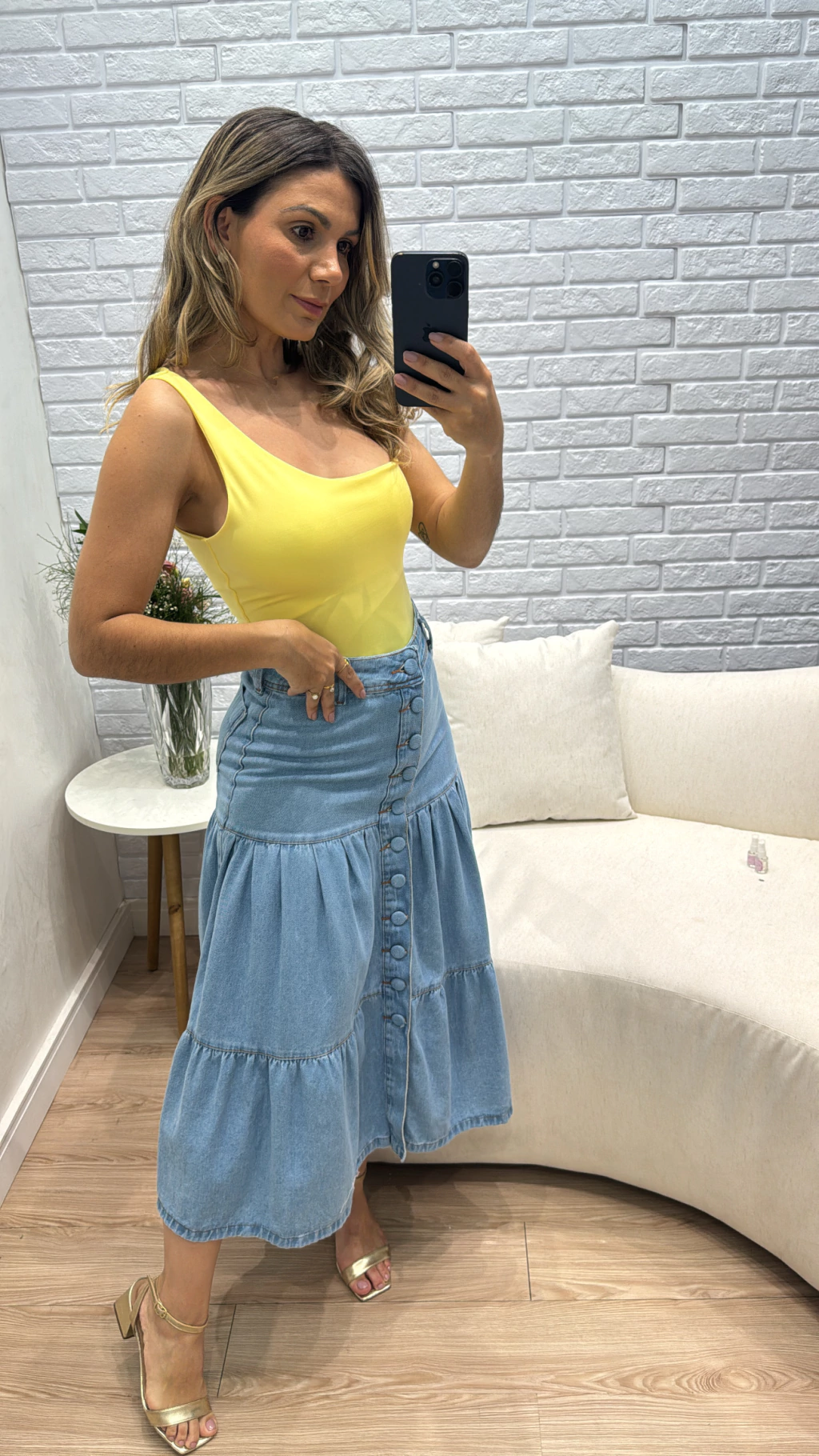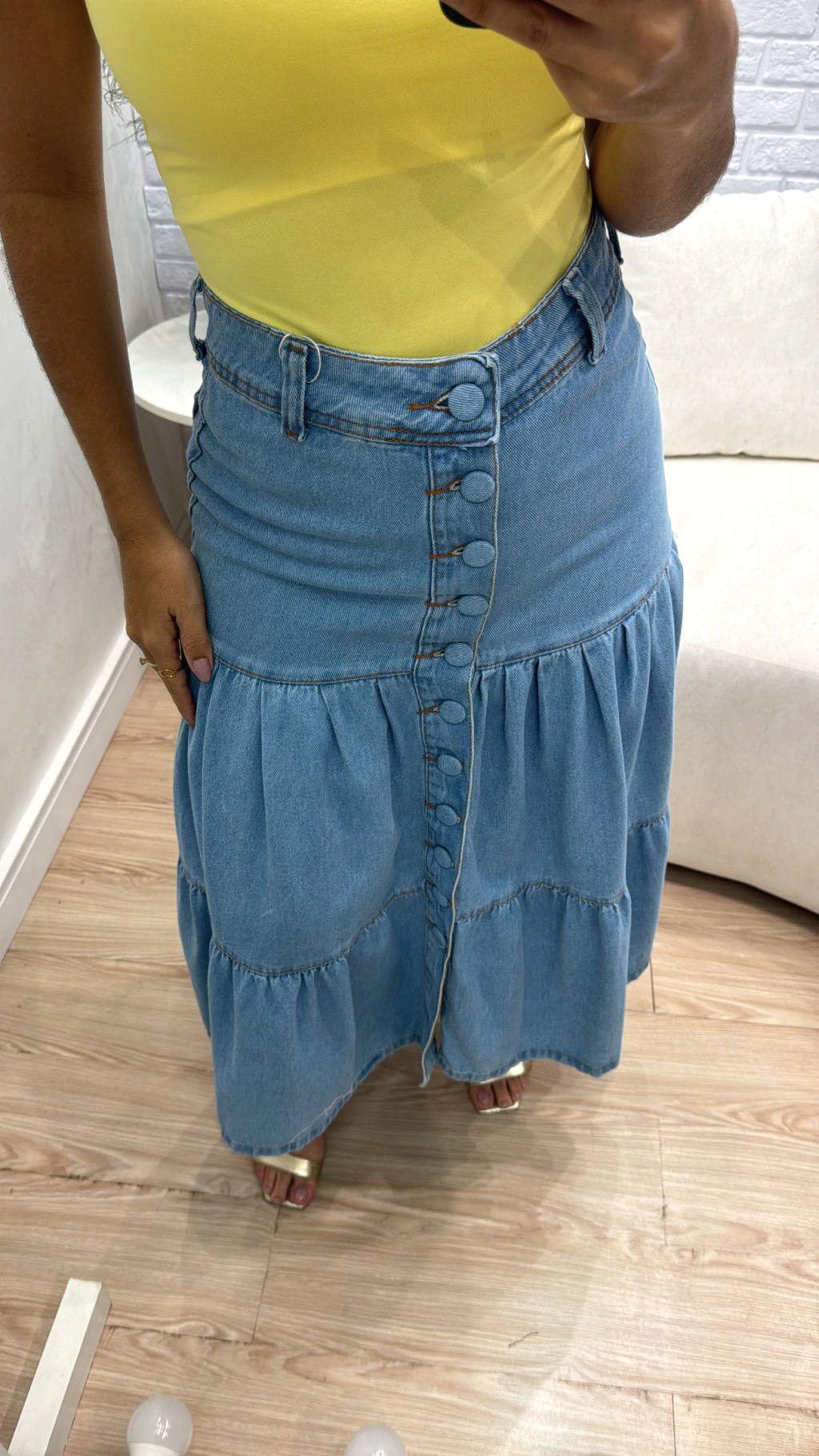 Jeans macio, botões encapado, modelagem cós alta, bolsos, comprimento mídi/longuete, passante de cinto.