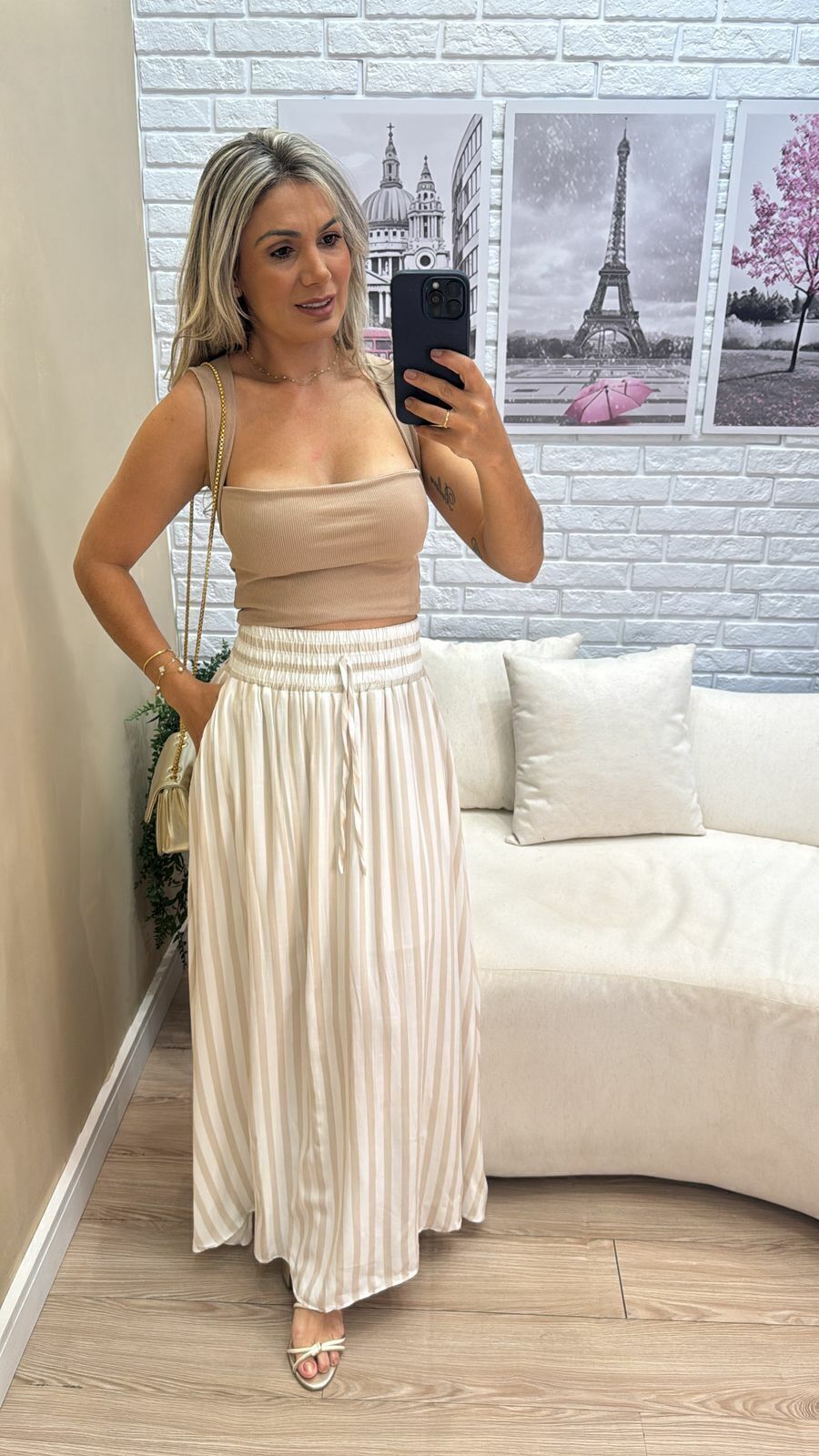 Em viscolinho pré lavado, cós alto, elástico na cintura, bolsos laterais, possui forro, faixa para amarração não ajusta, fendas laterais.