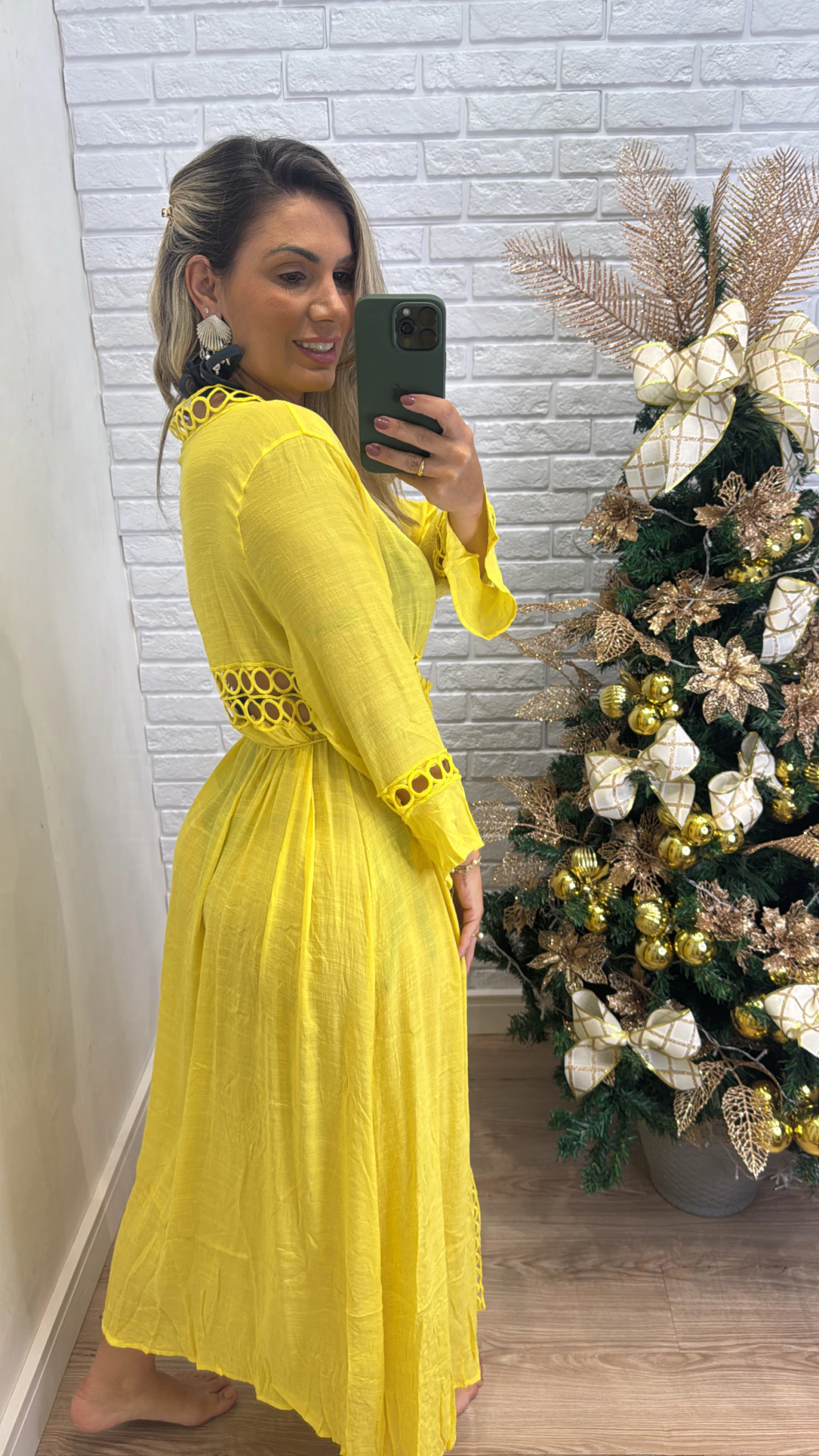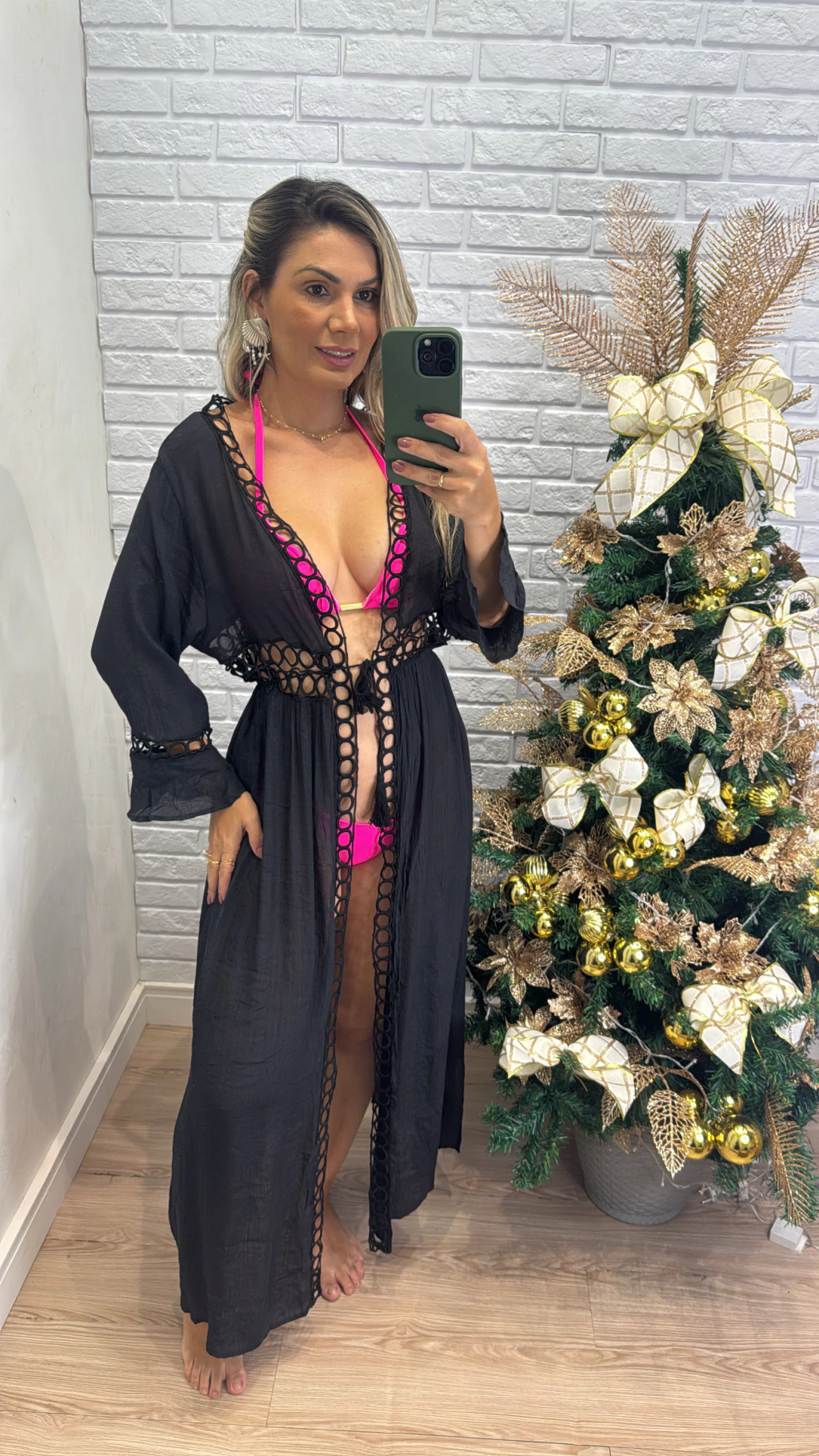 Cambraia, midi, mangas Flare, com aplicações em guipir,corte amplo, faixa com barbecacho nas ponteira.Tamanho único veste do P ao G.