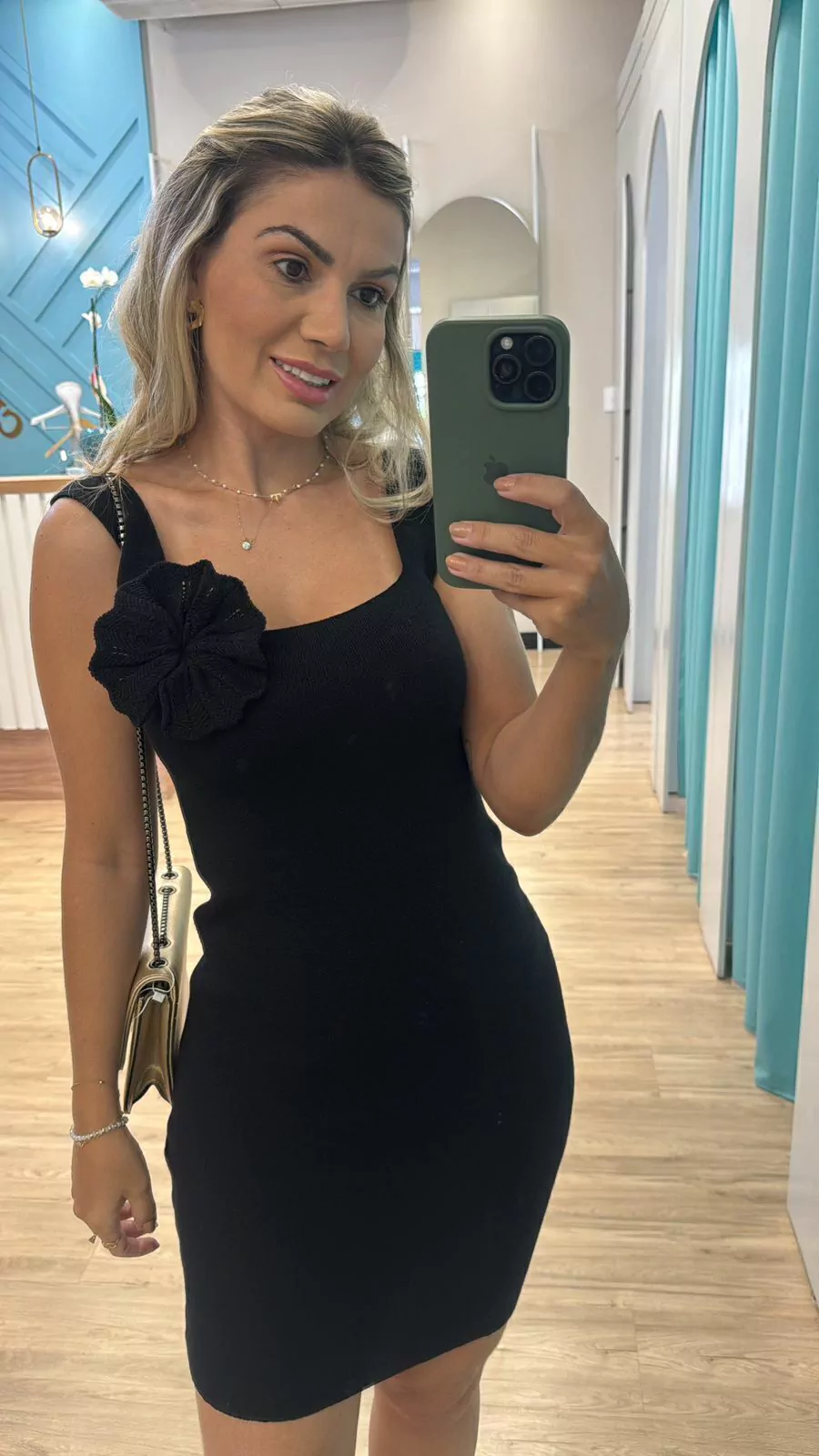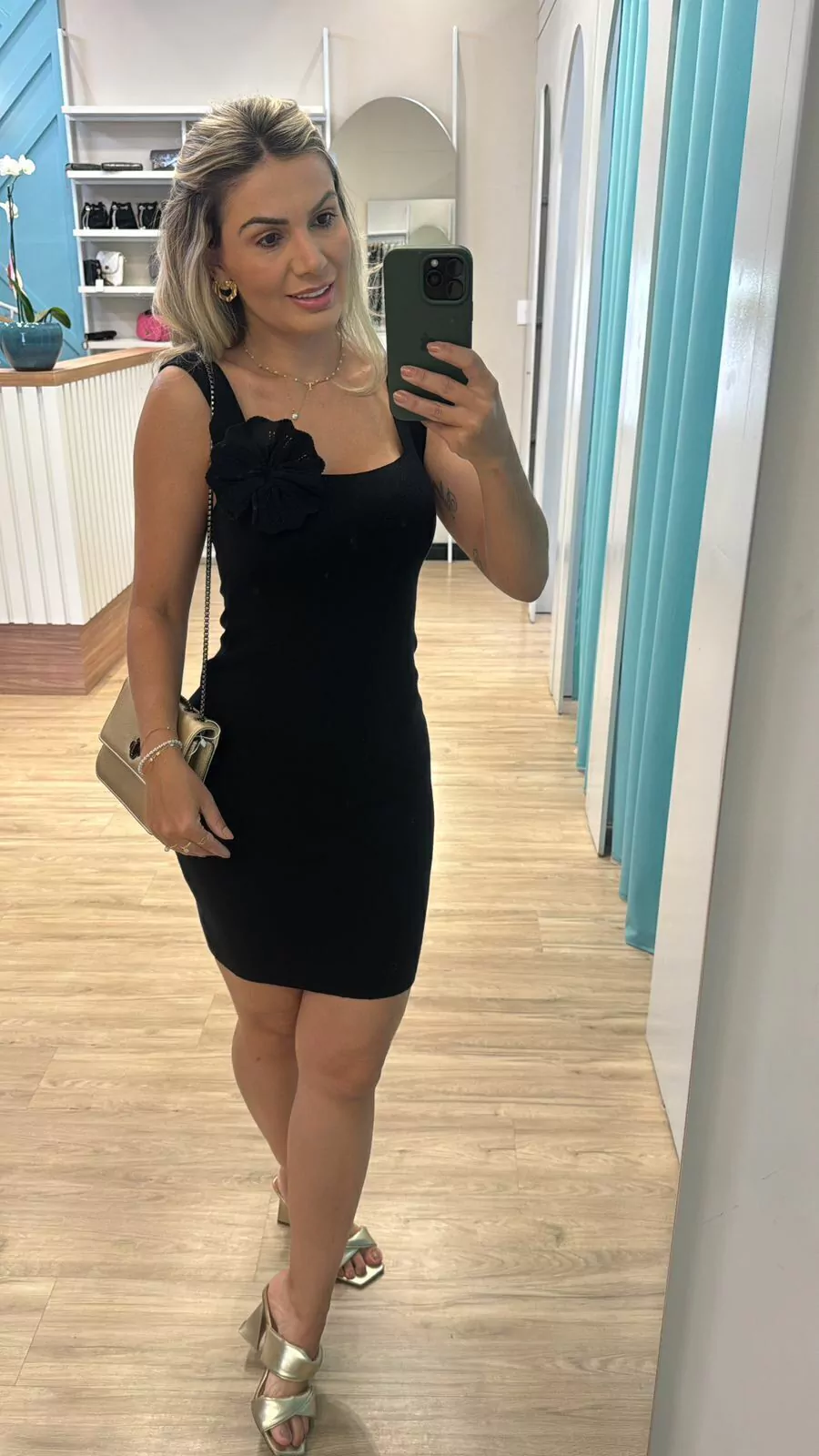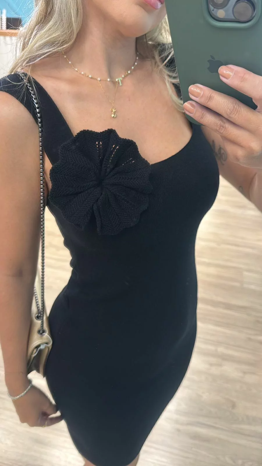 Em linha modal, alças largas, detalhe de flor em broche que pode ser removido, comprimento 7/8 tubinho.