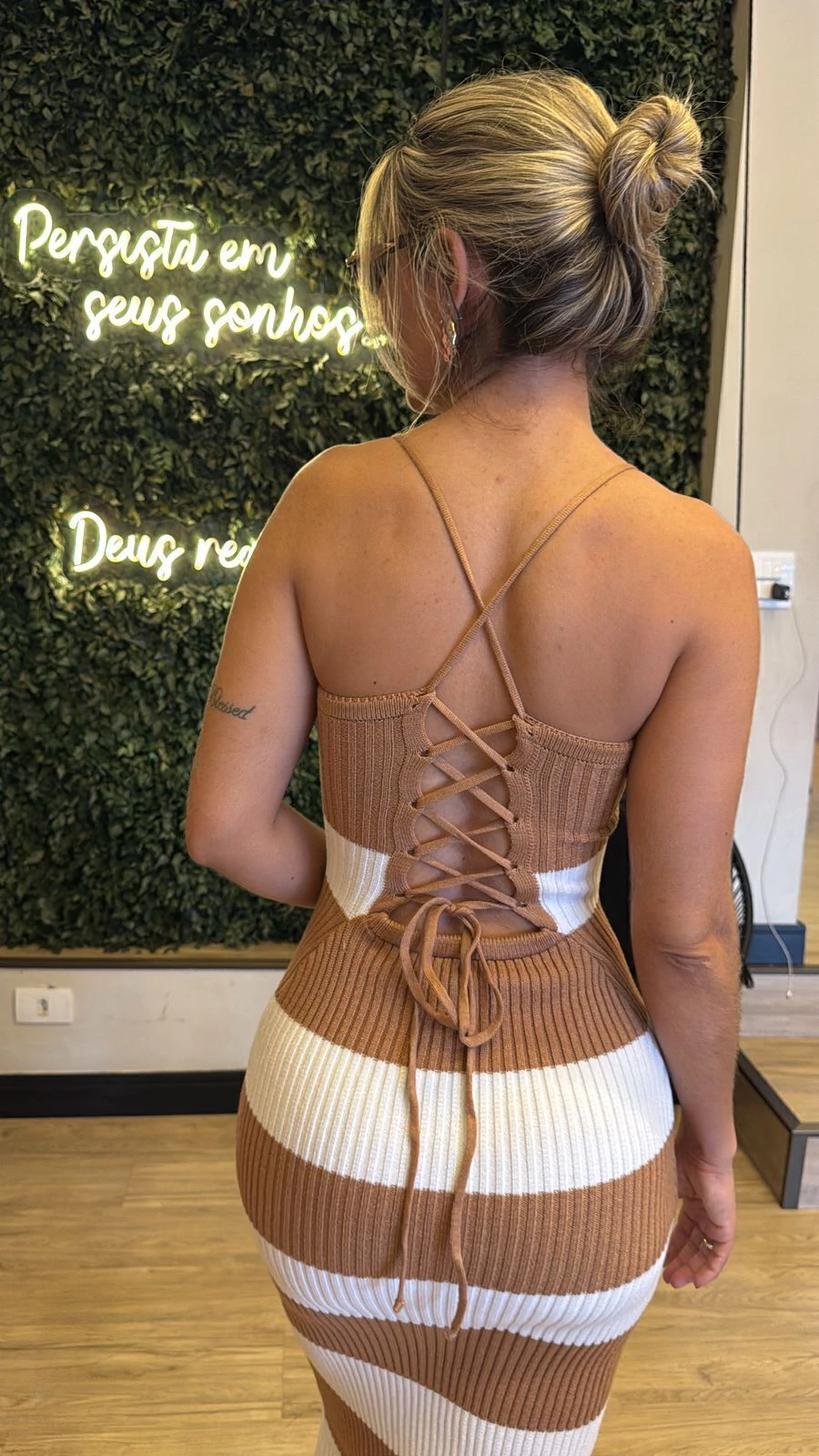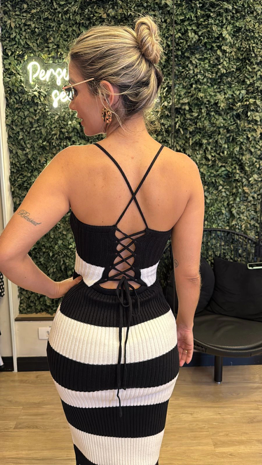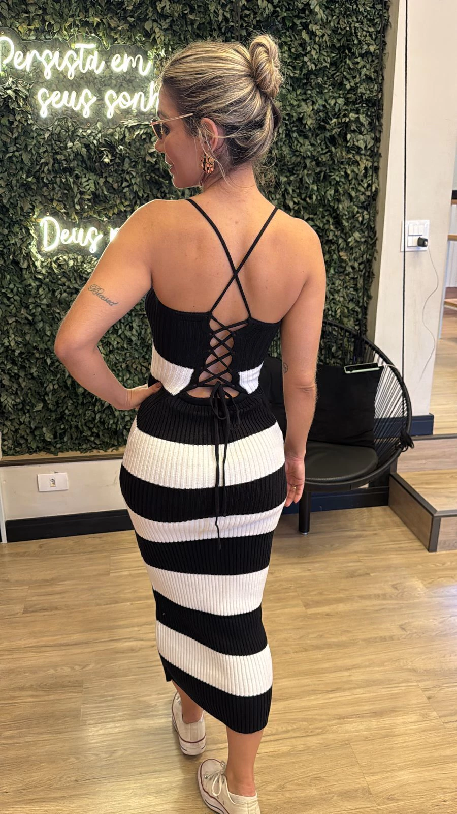 Seu diferencial está no detalhe trançado nas costas, que adiciona um toque único e elegante ao modelo. Sem fendas, ele veste do 36 ao 42/44, ficando coladinho e realçando as curvas com muita delicadeza.