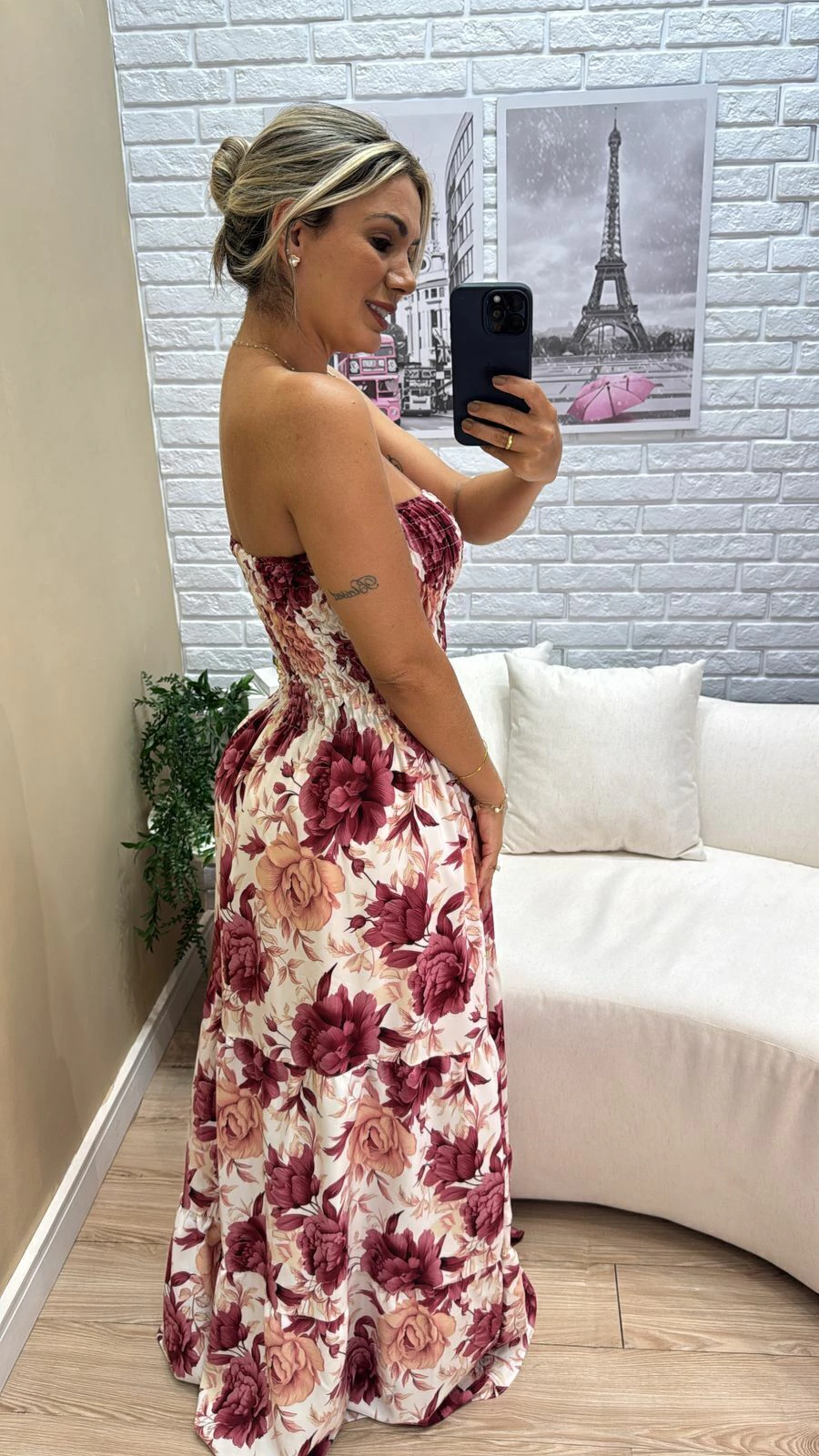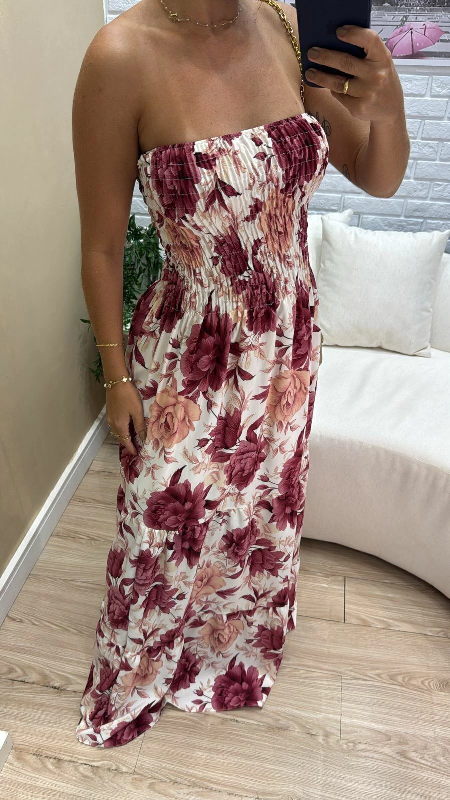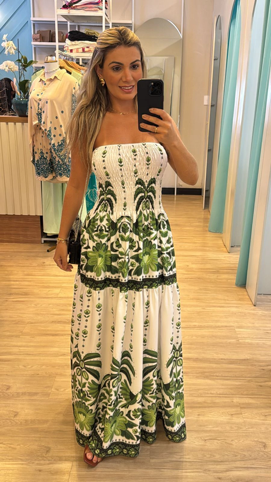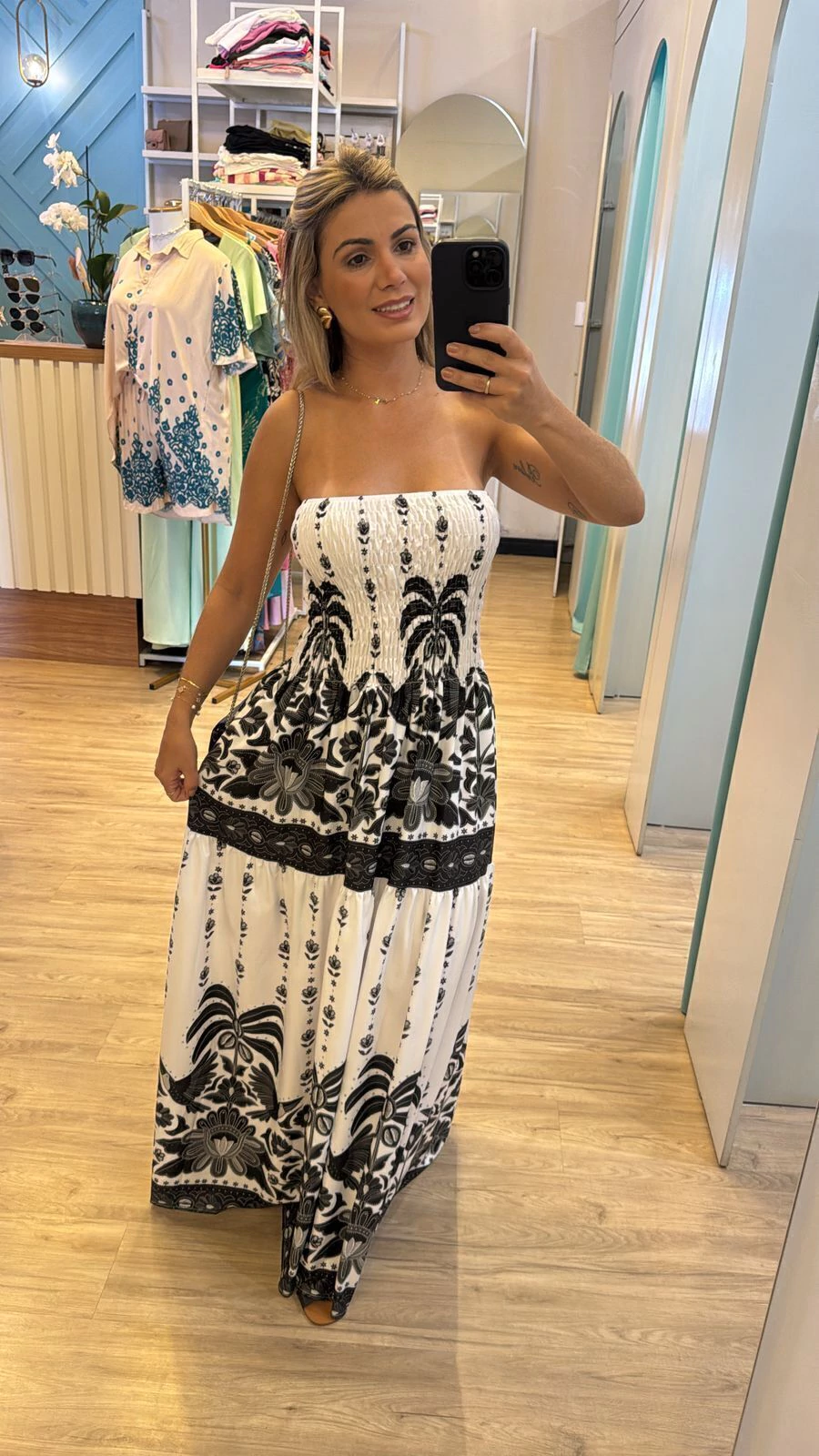 Sua modelagem tomara que caia com lastex na parte superior garante ajuste confortável e segurança, vestindo do 36 ao 44 com facilidade. A modelo, com 1,63m de altura, representa bem o caimento para pessoas um pouco mais altas.