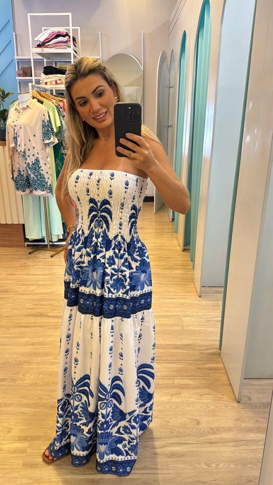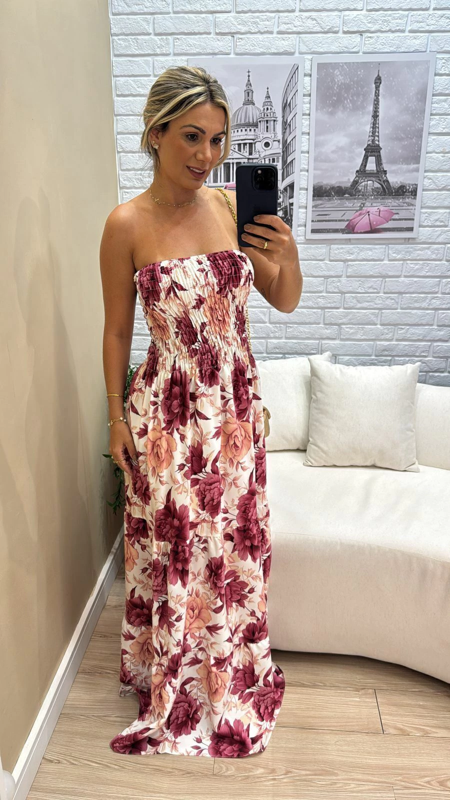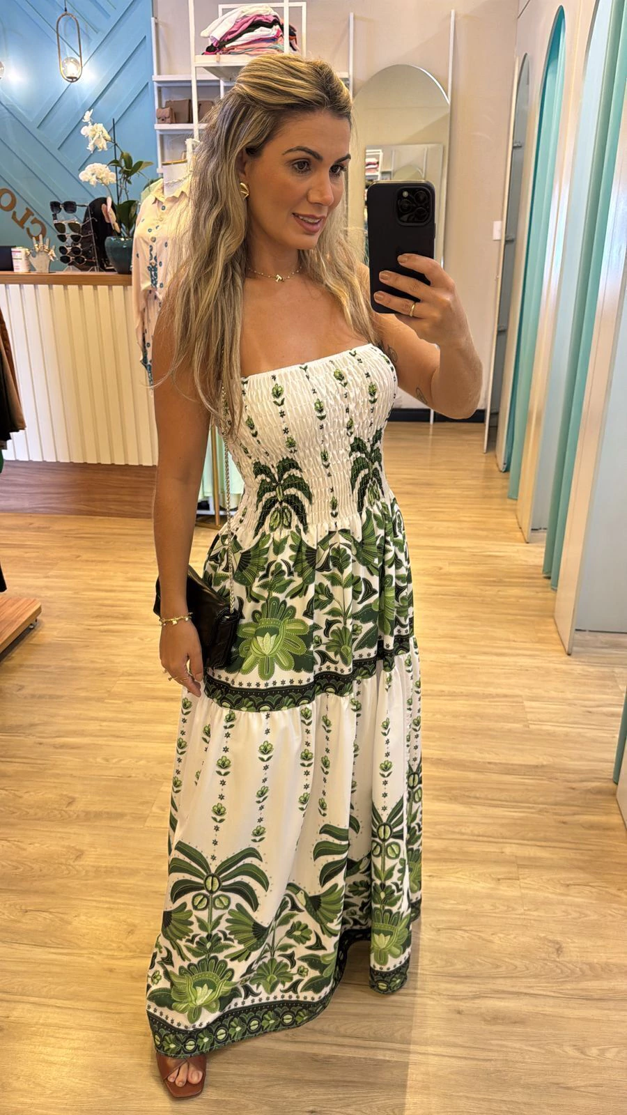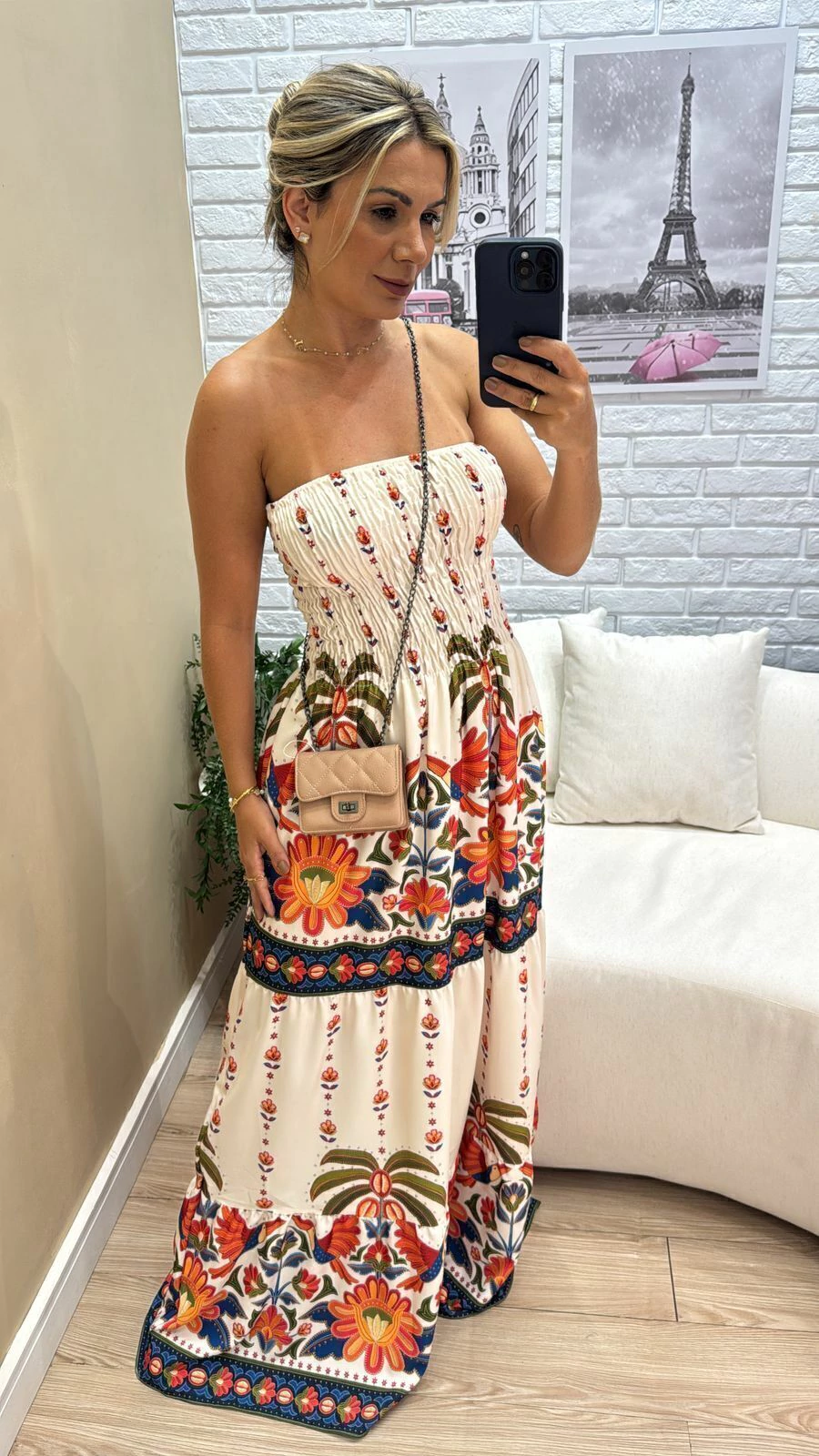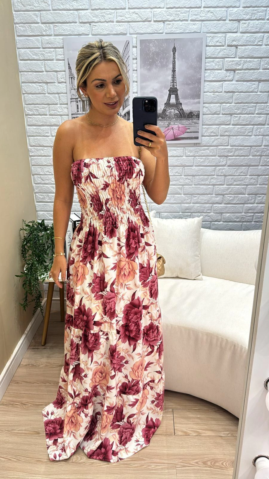 Sua modelagem tomara que caia com lastex na parte superior garante ajuste confortável e segurança, vestindo do 36 ao 44 com facilidade. A modelo, com 1,63m de altura, representa bem o caimento para pessoas um pouco mais altas.