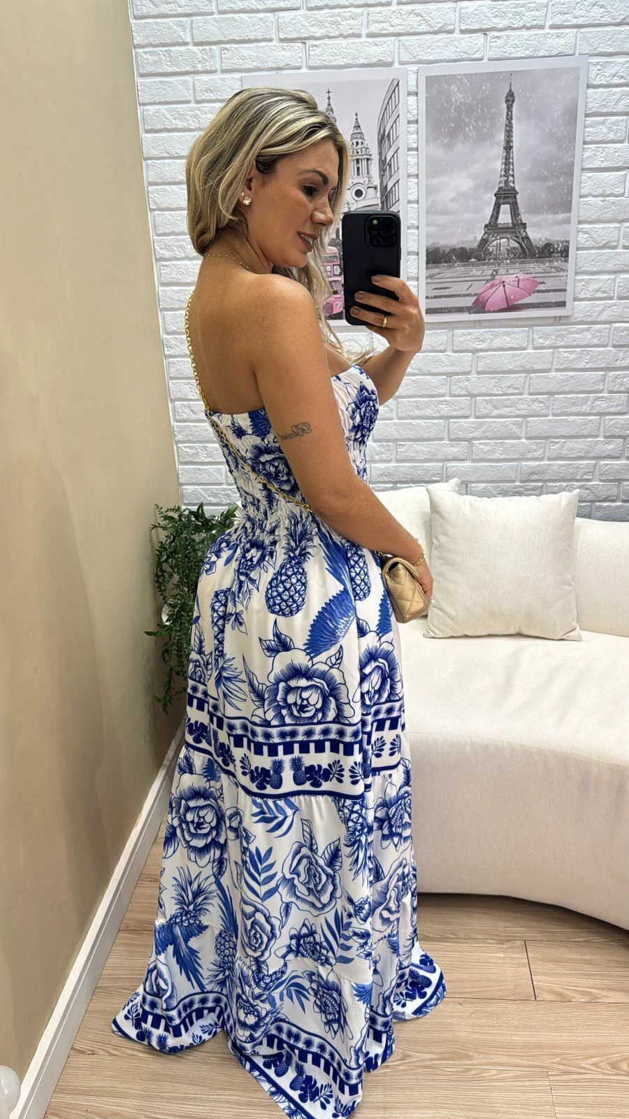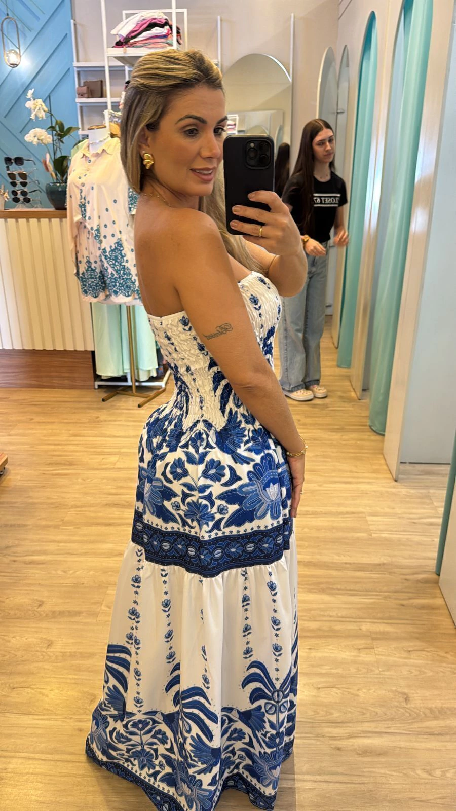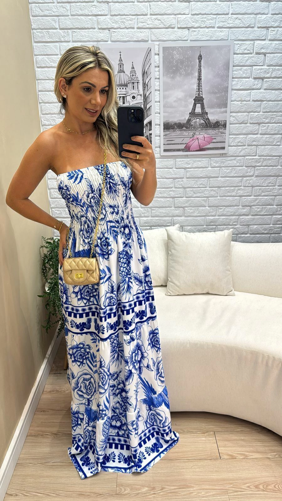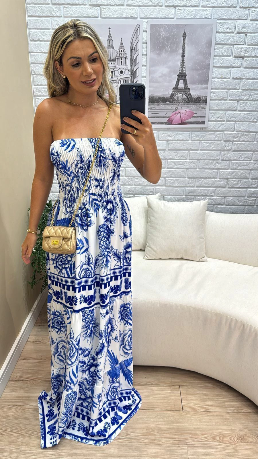 Sua modelagem tomara que caia com lastex na parte superior garante ajuste confortável e segurança, vestindo do 36 ao 44 com facilidade. A modelo, com 1,63m de altura, representa bem o caimento para pessoas um pouco mais altas.