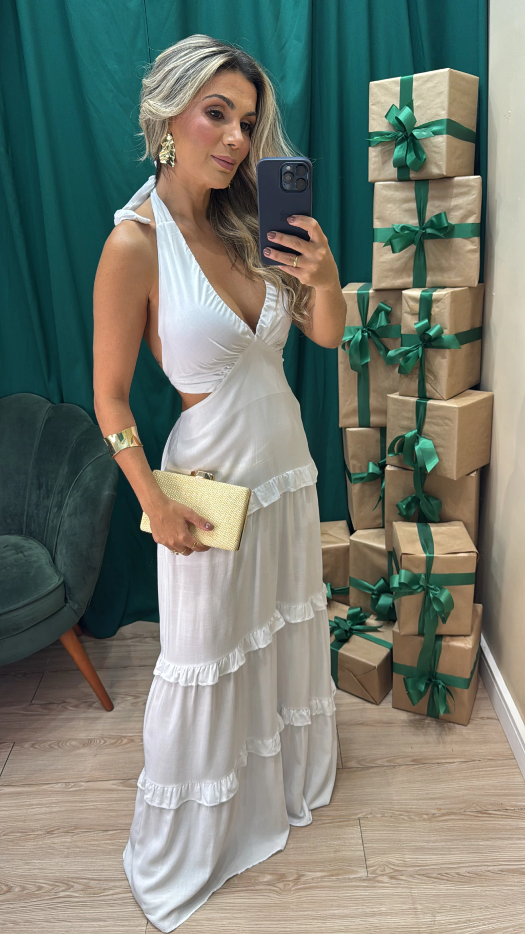 Tecido Viscolinho, tecido natural, fresco, amarração frente única e ajuste nas costas, bojo, comprimento de saia 4 Marias, forrado, veste 36 ao 42. Recorte assimétrico na cintura.
