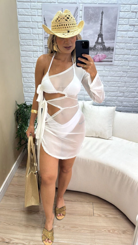 Características principais: - Tule branco com leve transparência - Nula manga - Recortes laterais e amarração - Tamanho único (36 ao 40/42)